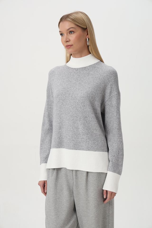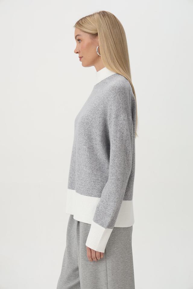 Пуловер имеет серый цвет с контрастной белой отделкой на горловине, манжетах и нижней части изделия. Это придает ему особый шарм и делает его более интересным.