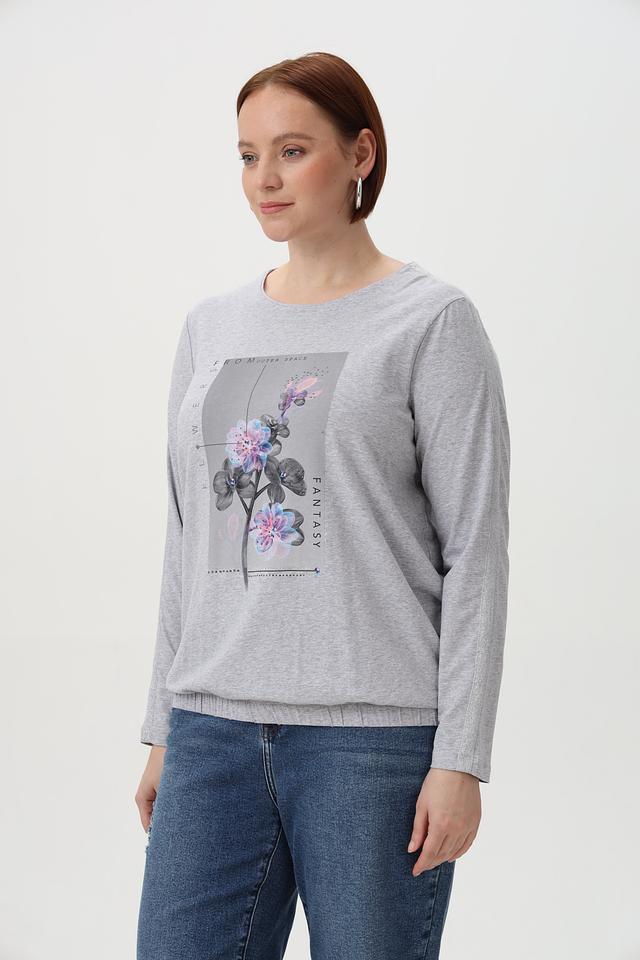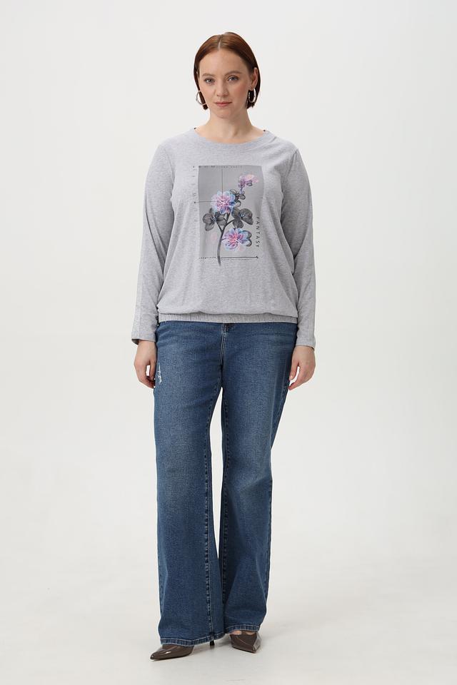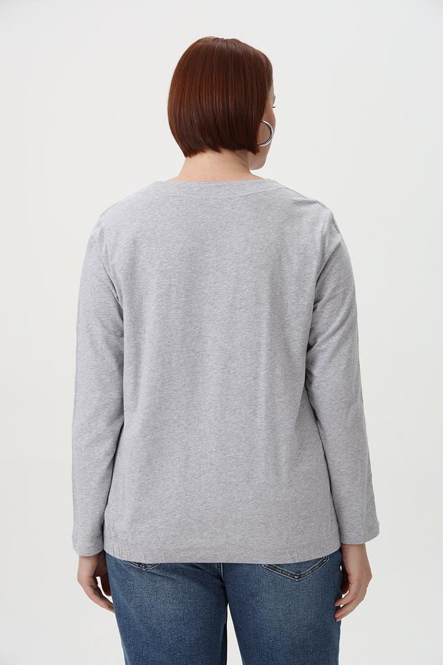 Модель имеет прямой, слегка свободный крой, длинные рукава и круглый вырез горловины. Основной цвет лонгслива – серый меланж, который легко сочетается с различными элементами гардероба.