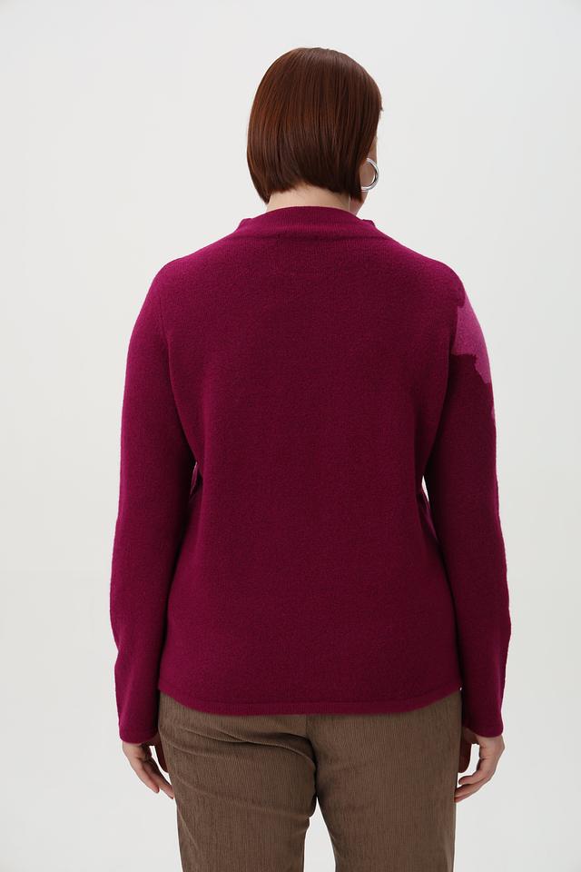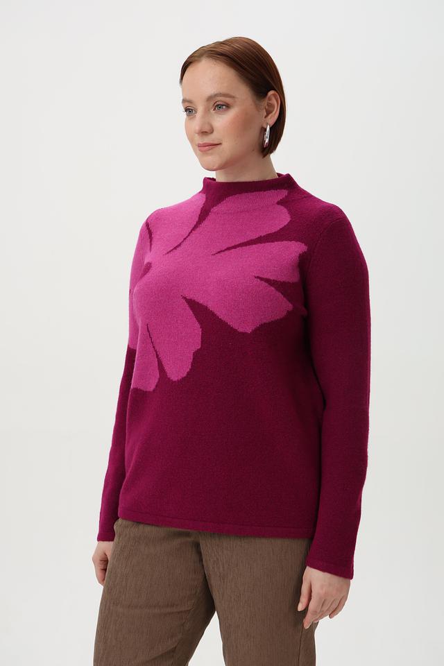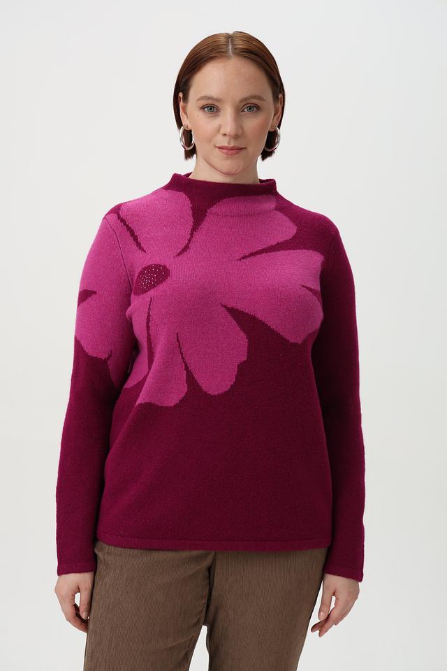 Пуловер имеет классический крой с длинными рукавами и воротником-стойкой. Главной особенностью модели является крупный цветочный принт, выполненный в оттенках фуксии и розового, который добавляет образу женственности и оригинальности.