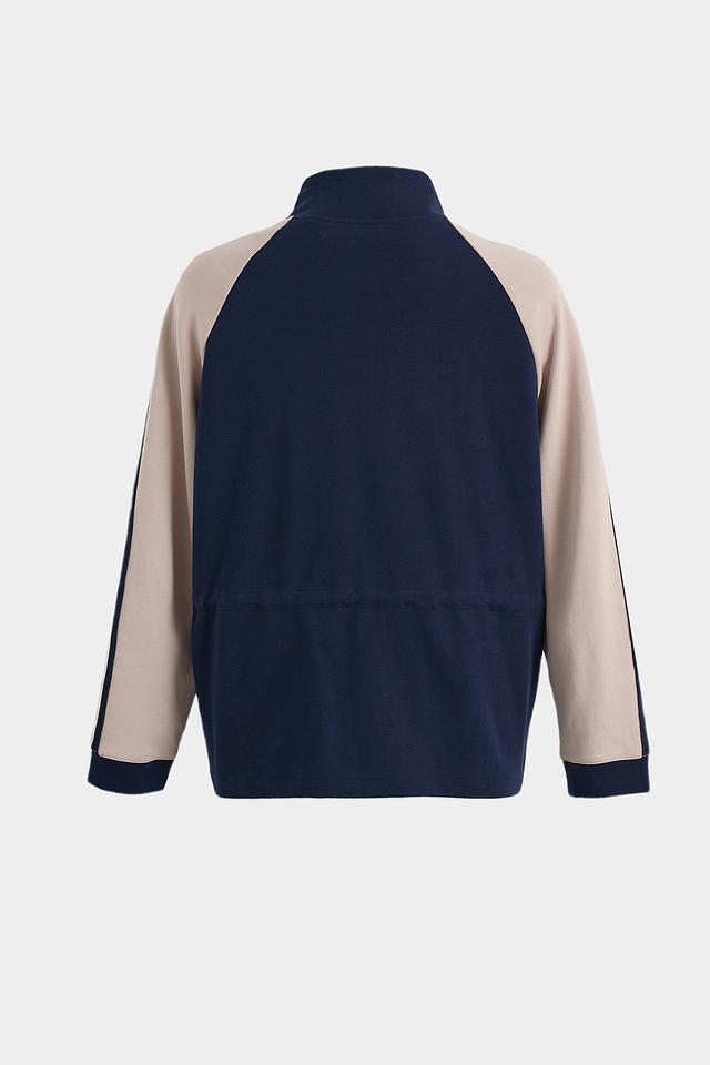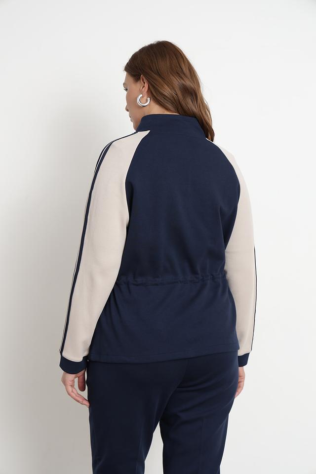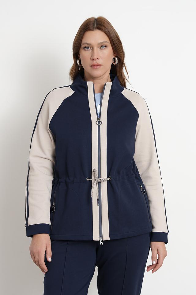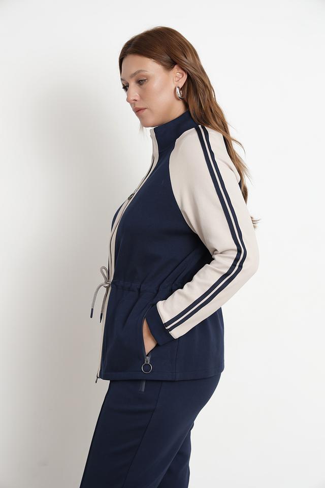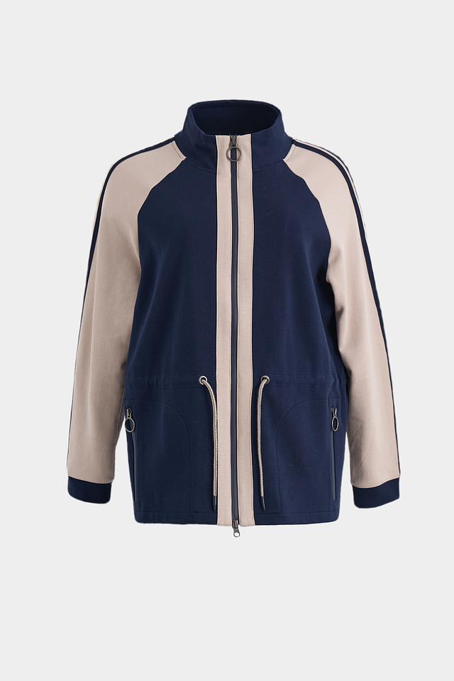 Жакет имеет удобную застежку-молнию, воротник-стойку и боковые карманы на молнии. Декоративные бежевые полосы на рукавах и талии добавляют динамики образу. Утяжки на талии позволяют регулировать силуэт.