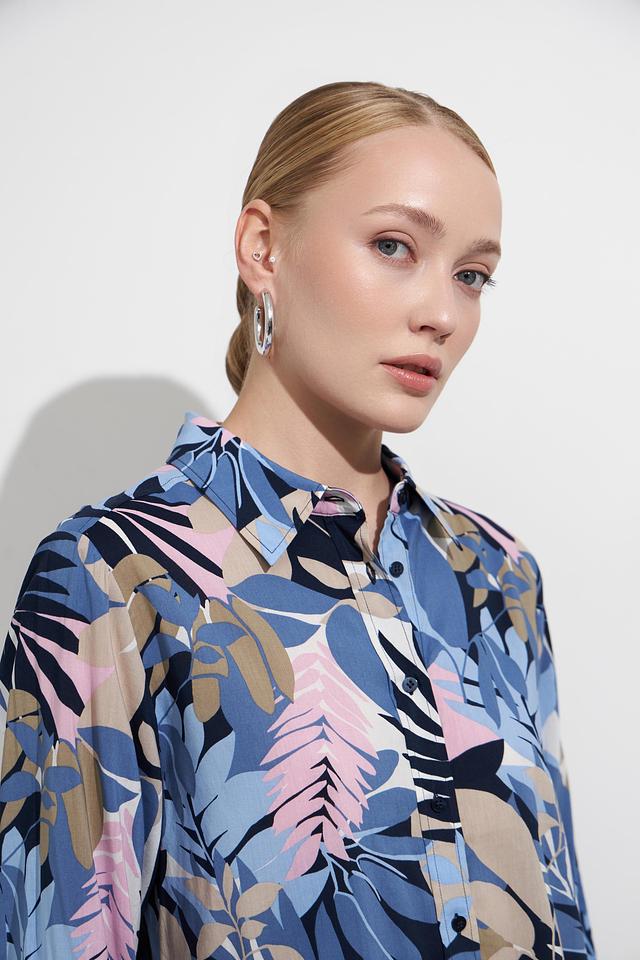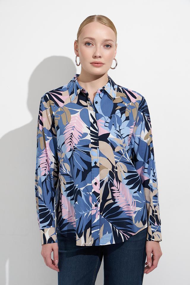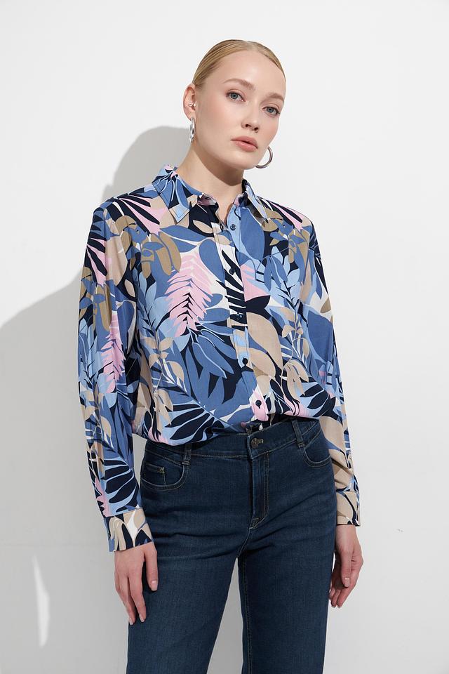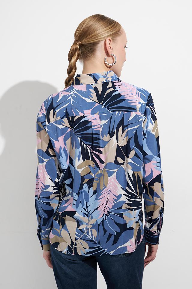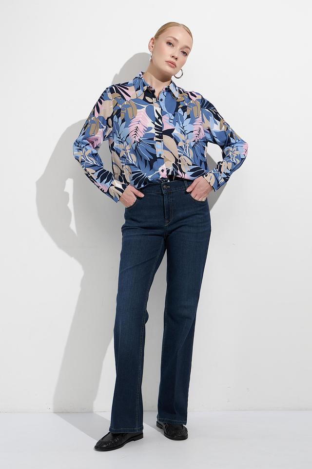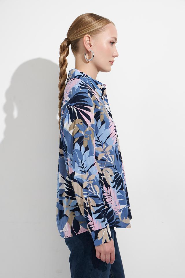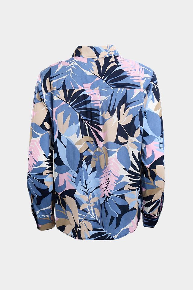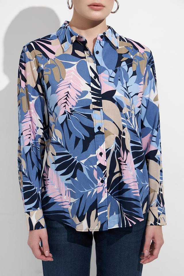 Блуза имеет классический крой с длинными рукавами и воротником рубашечного типа. Застёжка на пуговицы позволяет регулировать степень прилегания. Главная особенность модели – яркий и красочный принт с изображением тропических листьев в синих, бежевых и розовых тонах.
