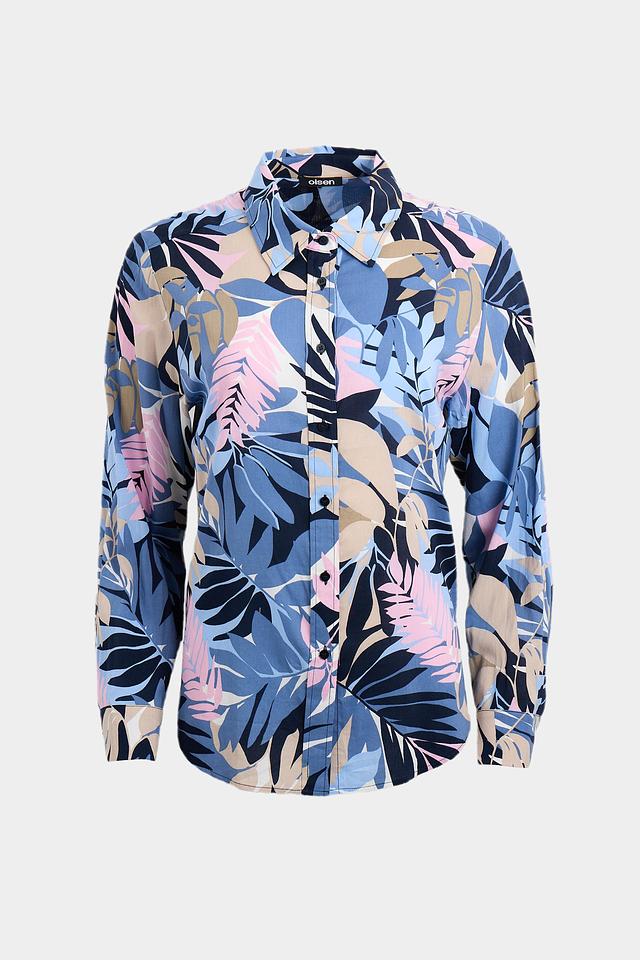 Синяя блуза от Olsen с ярким тропическим принтом станет стильным дополнением к вашему гардеробу. Модель выполнена из лёгкой и приятной к телу ткани, идеально подходит для создания повседневных образов. Состав: вискоза 50%, хлопок 50%