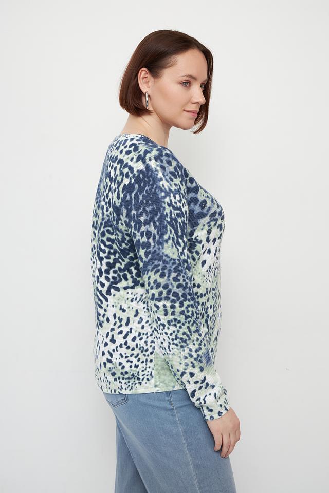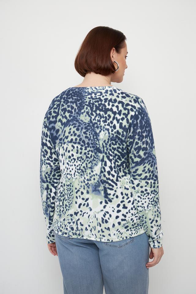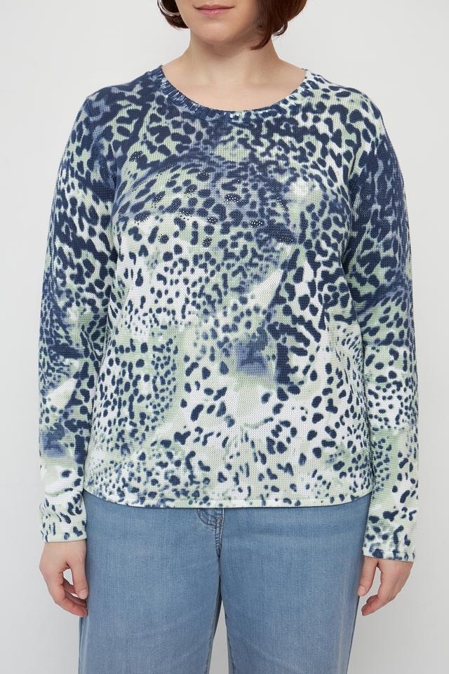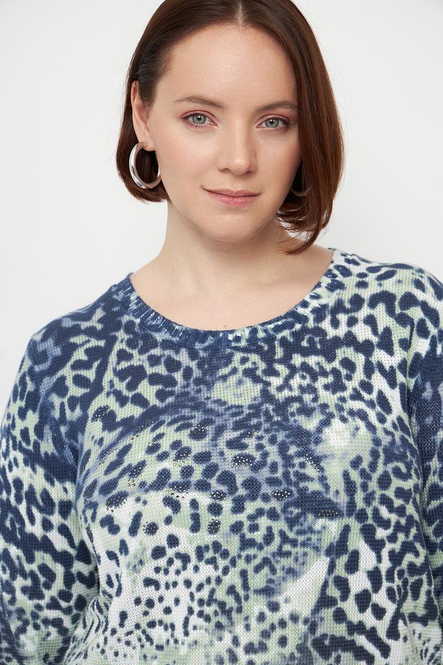Дизайн пуловера привлекает внимание необычным леопардовым принтом, сочетающим в себе оттенки синего и зелёного. Круглый вырез горловины и длинные рукава делают его универсальным для различных погодных условий.