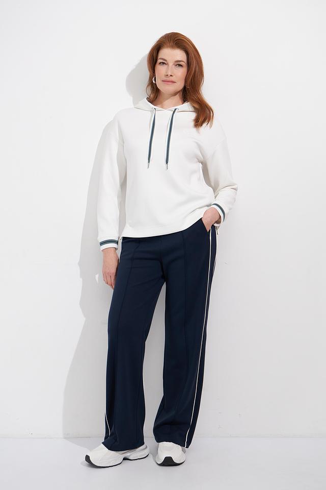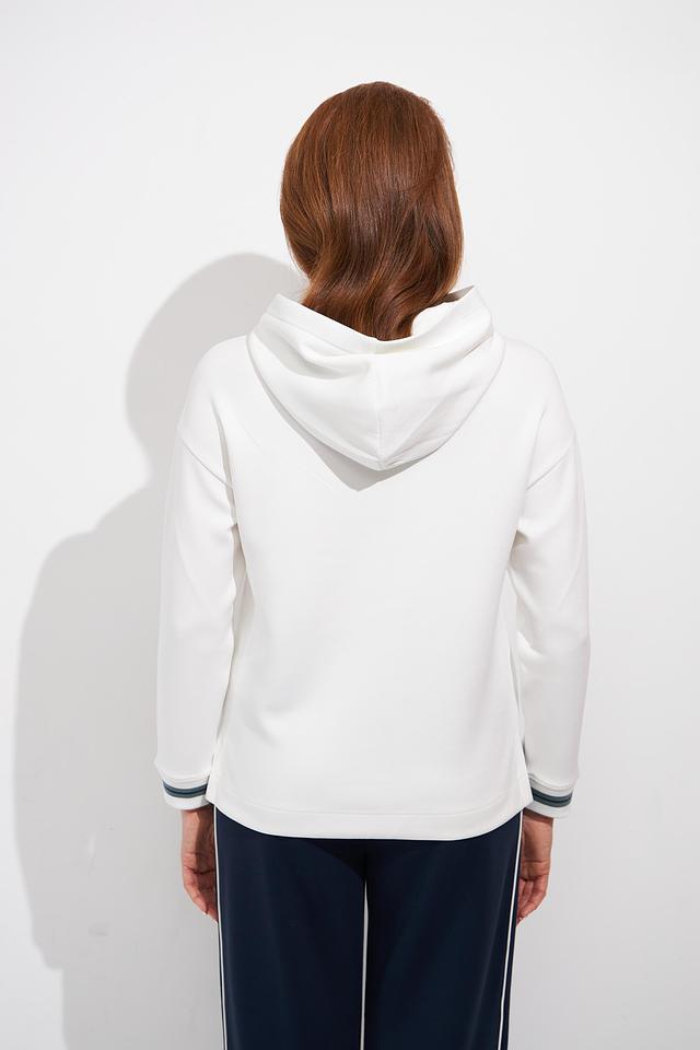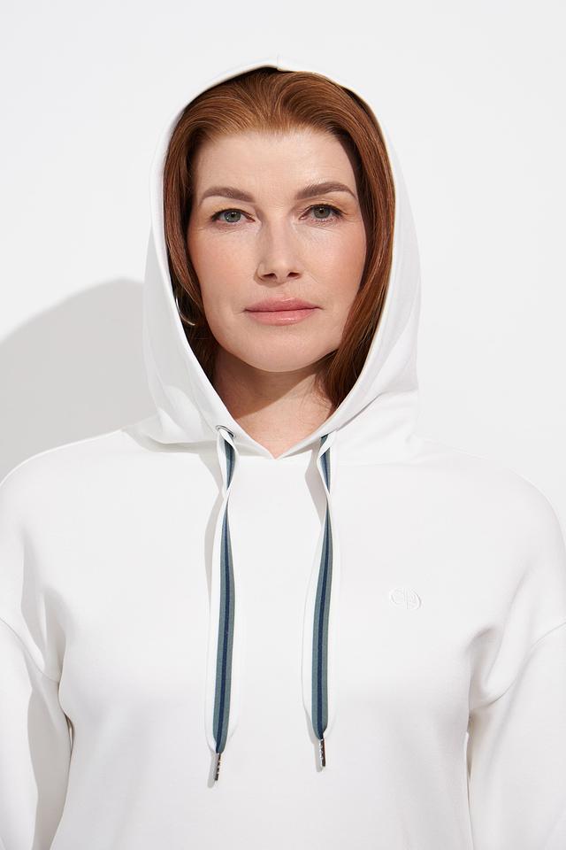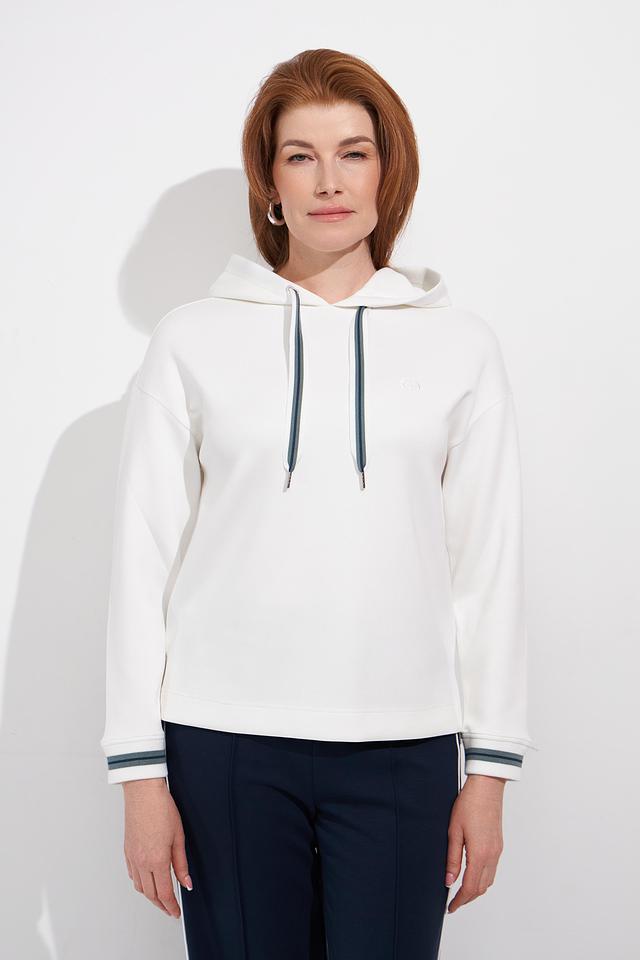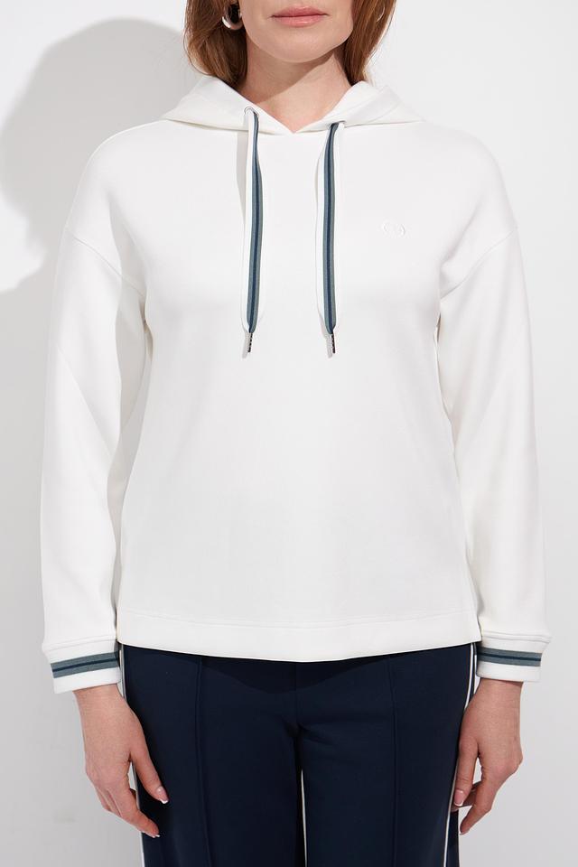 Белый пуловер от Olsen с капюшоном и контрастными шнурками. Модель выполнена из мягкого трикотажа с добавлением вискозы и эластана, что обеспечивает комфорт и удобство в носке. Отличается лаконичным дизайном и стильным оформлением. Состав: полиэстер 55%, вискоза 40%, эластан 5%
