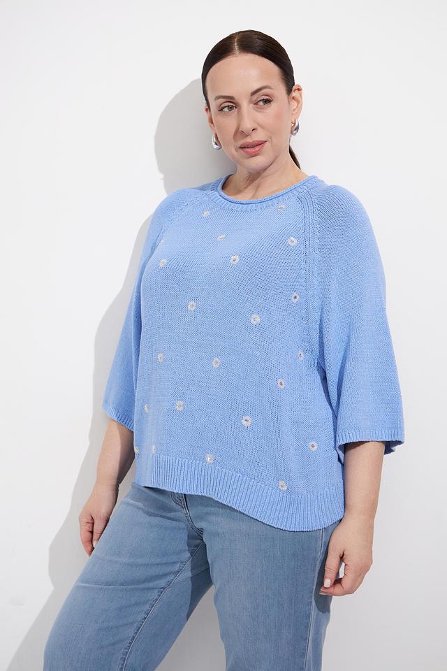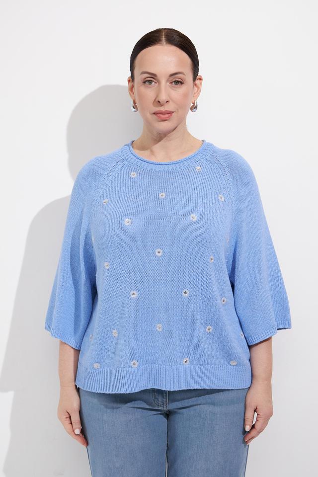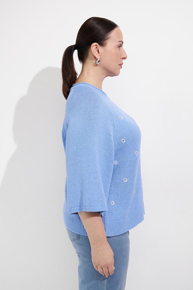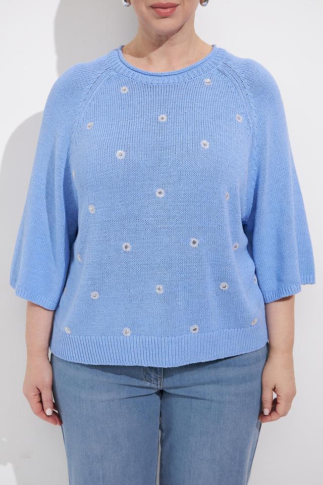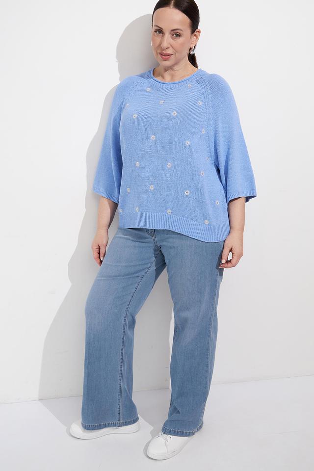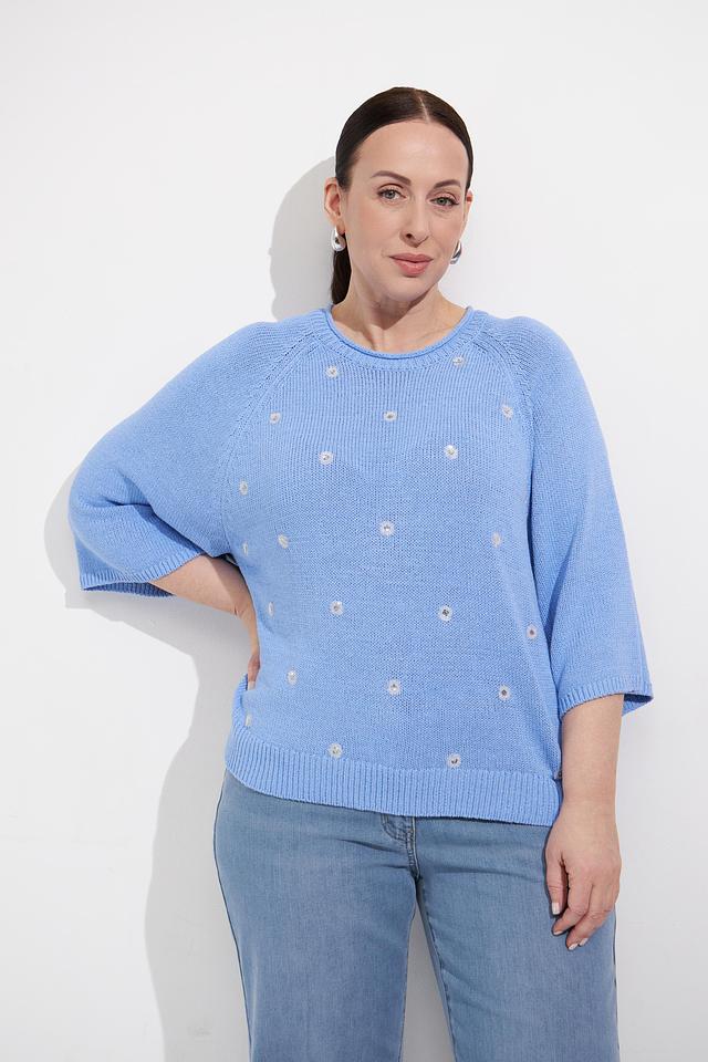 Пуловер украшен деликатным цветочным принтом, который добавляет женственности и легкости. Вырез горловины – округлый, классический. Текстура вязки мягкая и приятная на ощупь.