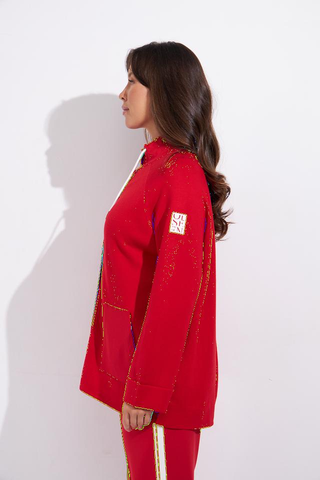 Жакет имеет прямой крой, застёгивается на пуговицы и дополнен капюшоном со шнурками. Отличительной особенностью модели является декоративная отделка по краям изделия и на карманах, выполненная в контрастных цветах.