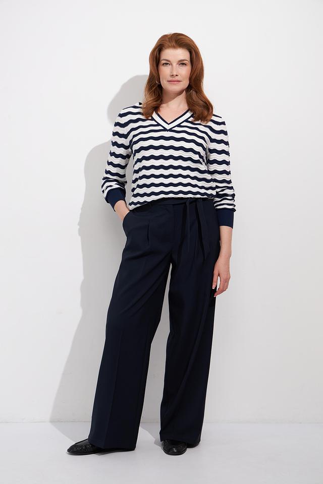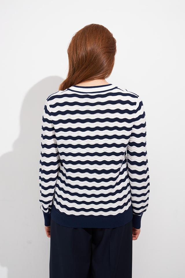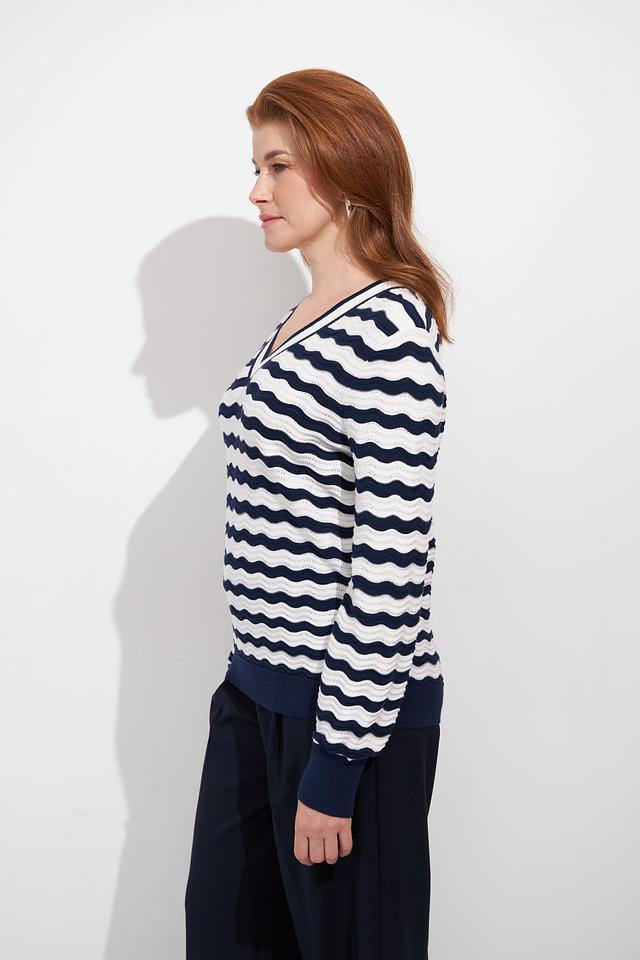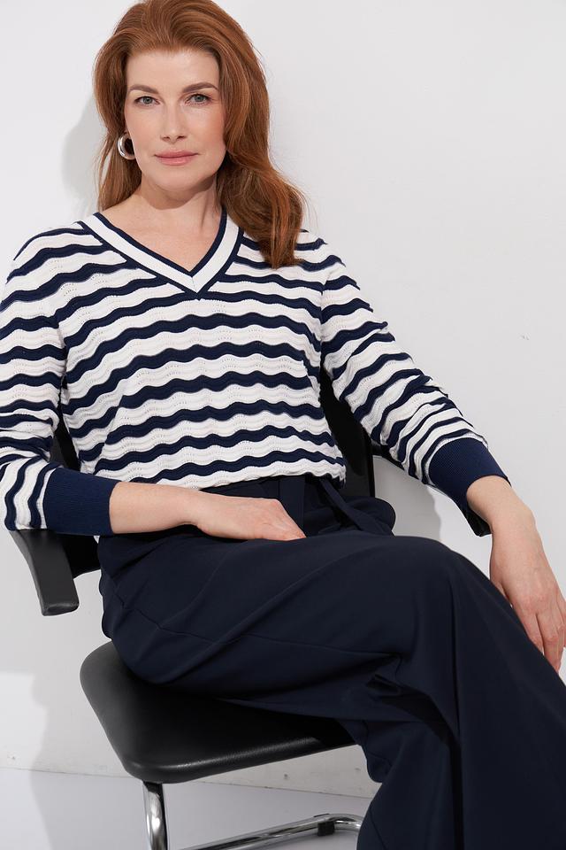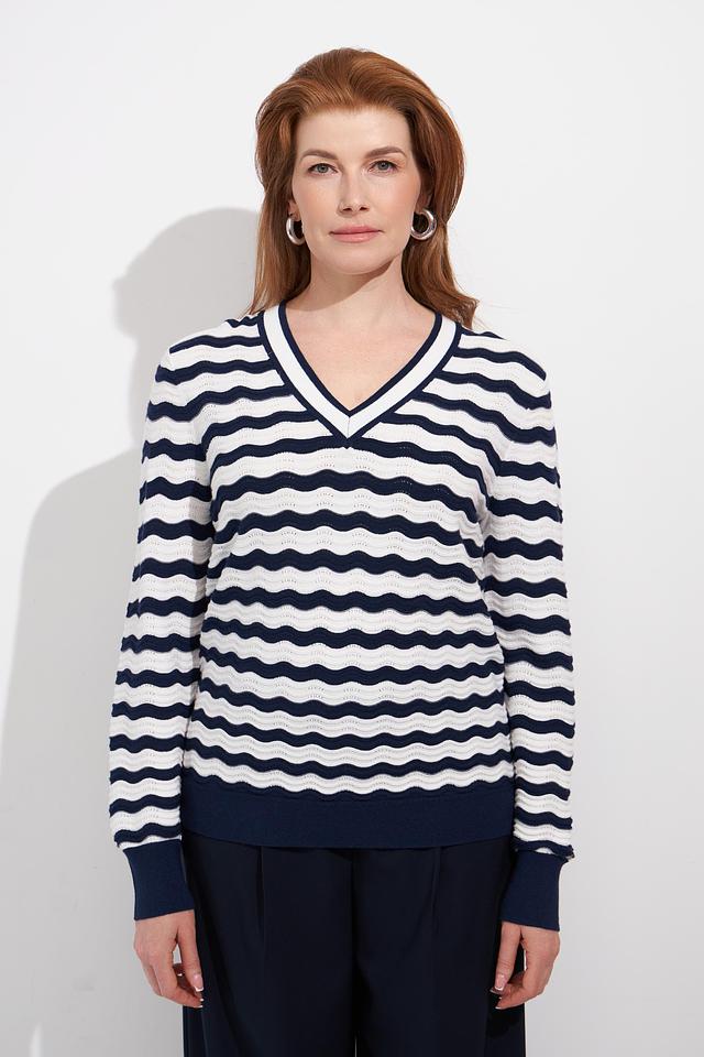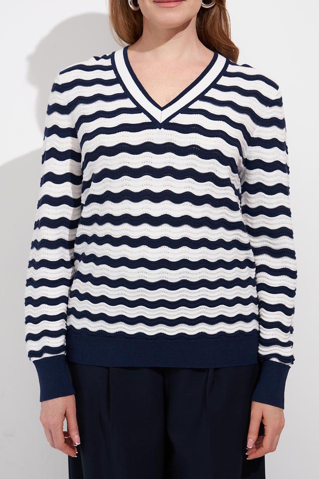 Женский пуловер Olsen сине-белого цвета с V-образным вырезом и полосатым узором. Изготовлен из мягкой вискозы с добавлением полиэстера для комфорта и долговечности. Стильный и универсальный выбор для создания повседневных образов. Состав: вискоза 72%, полиэстер 28%