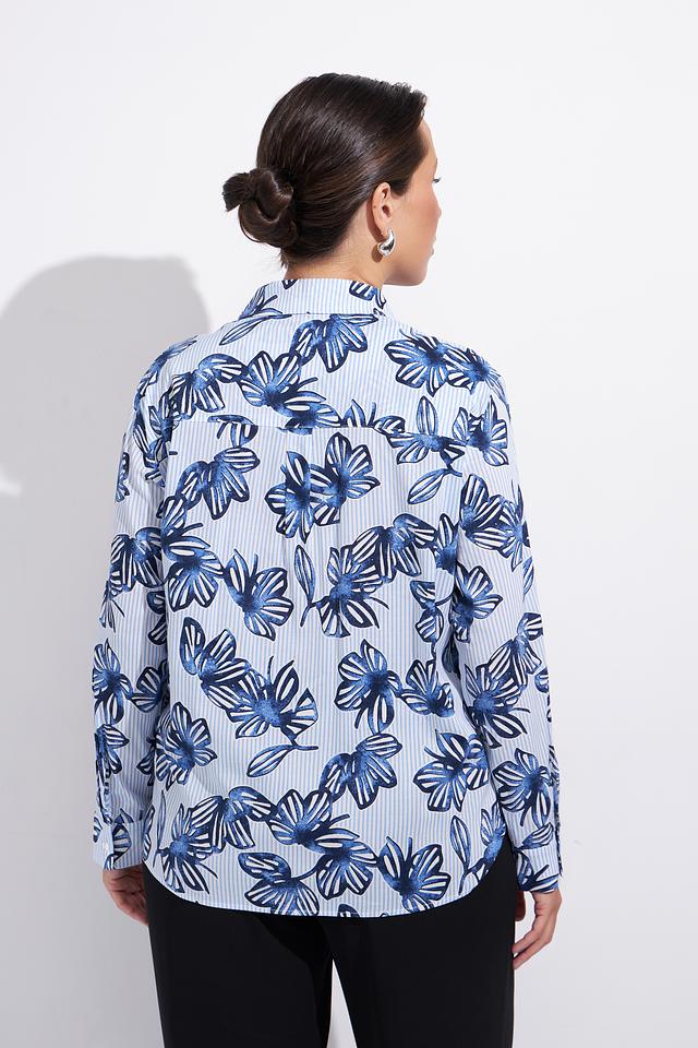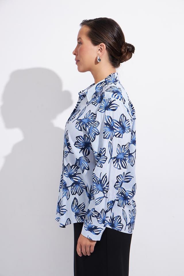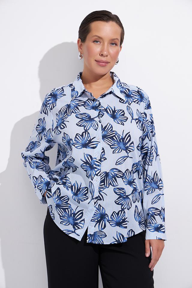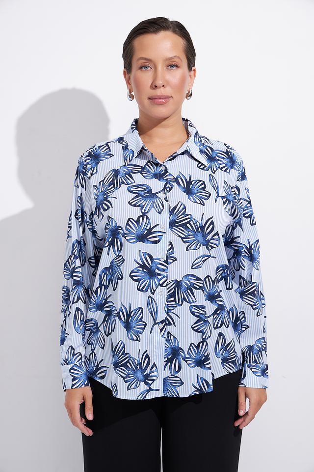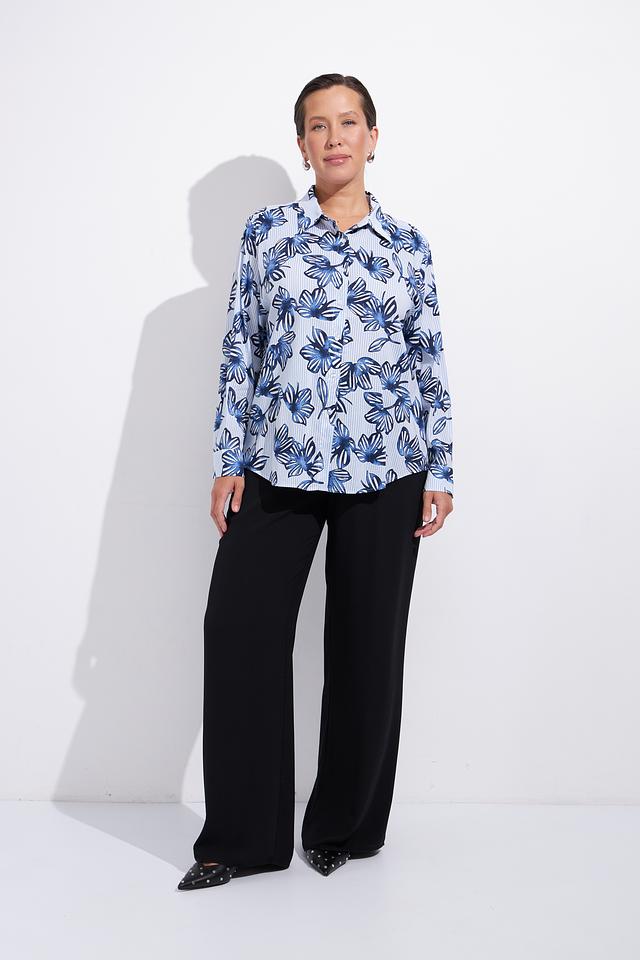 Основной цвет блузы – голубой, а ярким акцентом является принт из крупных синих цветов. Блуза имеет классический крой с длинными рукавами и отложным воротником. Застёжка выполнена на пуговицы.