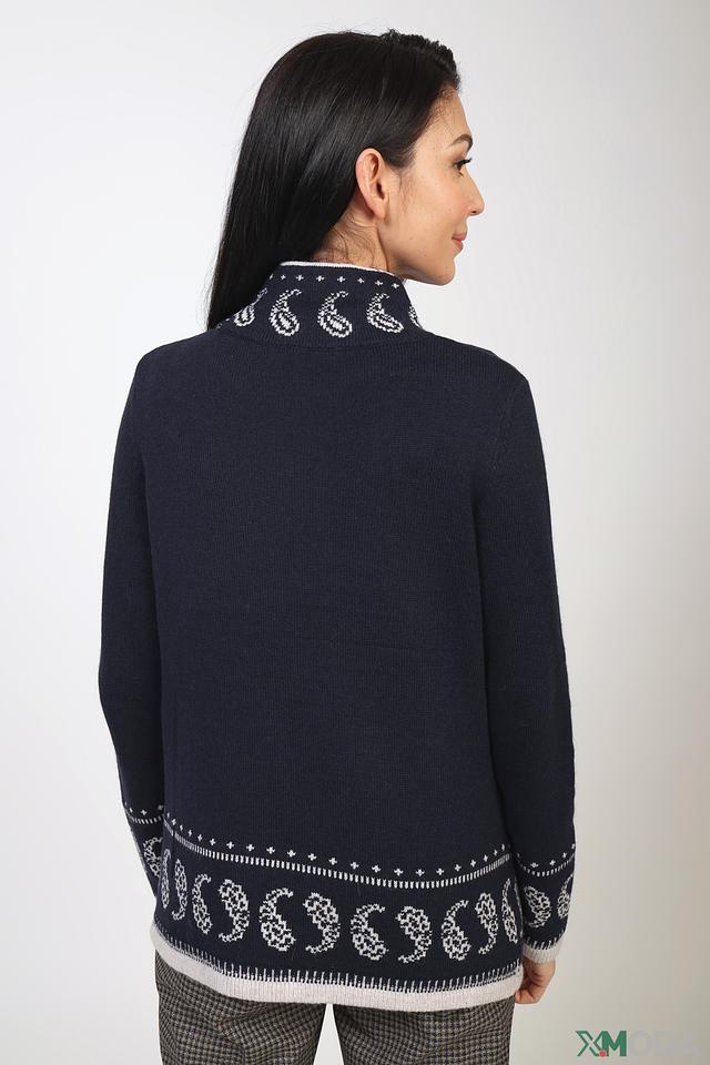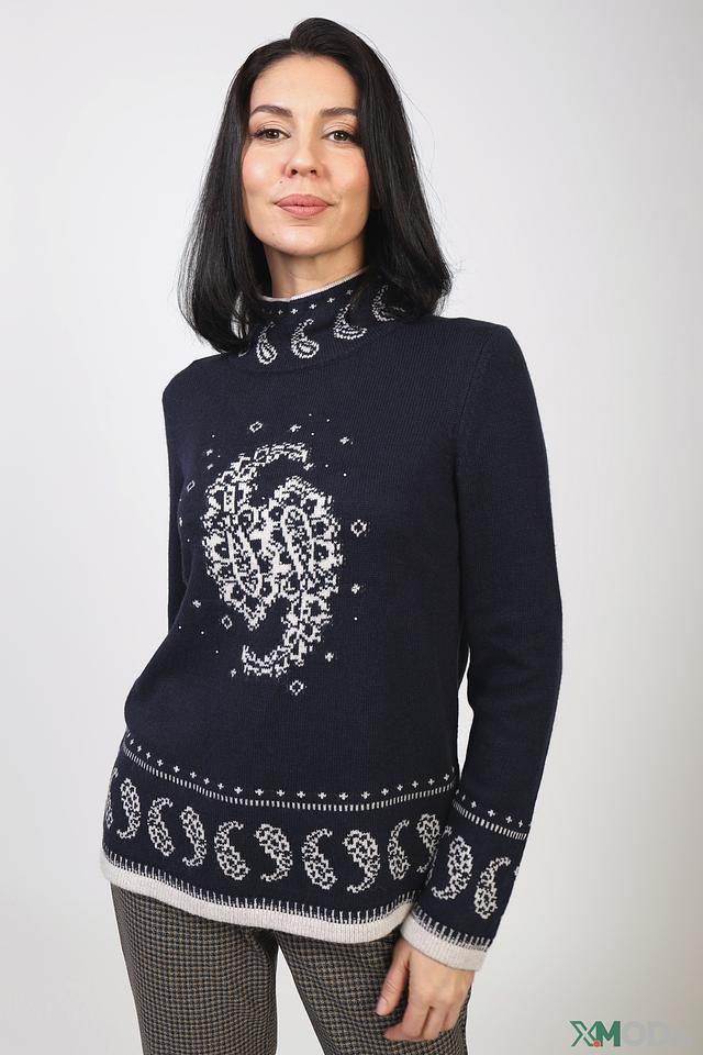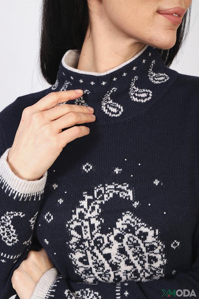 Пуловер выполнен в тёмно-синем цвете и украшен выразительным жаккардовым узором, который придает ему индивидуальность. Декоративные элементы в виде белых и светло-серых мотивов создают контрастный и привлекательный вид.