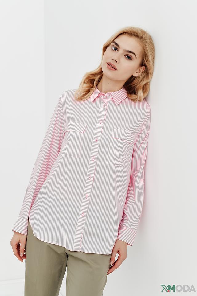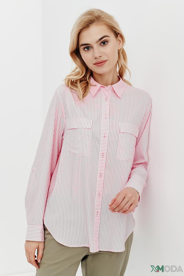 Рубашка имеет классический крой с длинными рукавами и отложным воротником. Она оформлена в светлую полоску, сочетающую розовый и белый цвета, что придает ей свежий и женственный вид. На груди расположены накладные карманы, добавляющие функциональности и стиля.