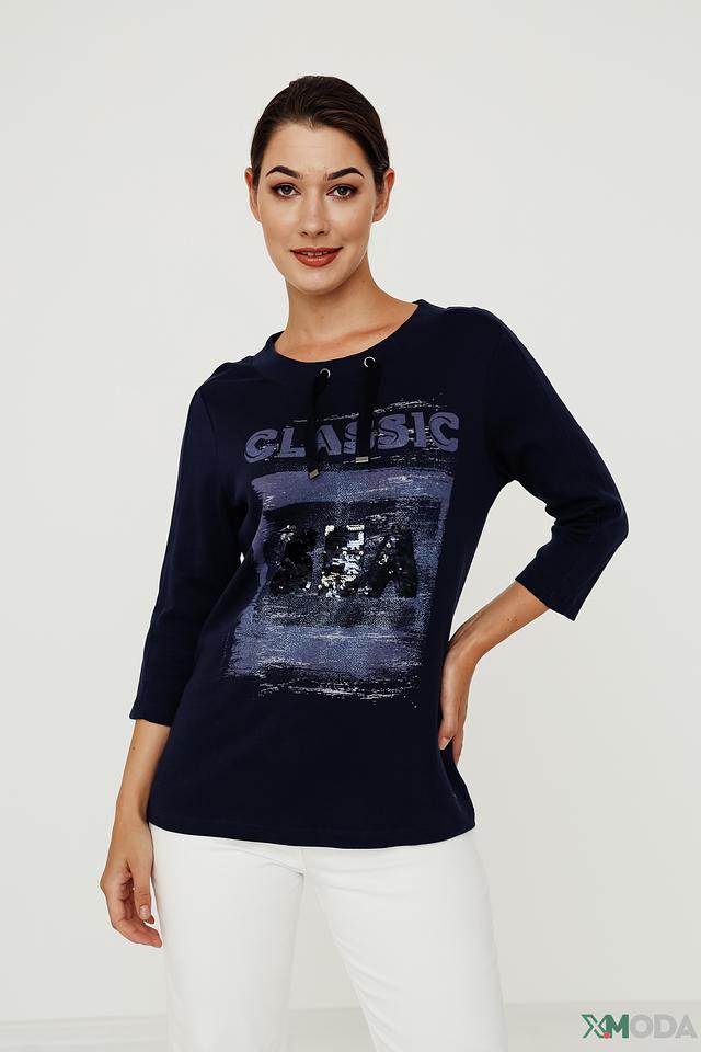 Женский пуловер Olsen темно-синего цвета с оригинальным принтом "Classic" и рукавами 3/4. Изготовлен из мягкого хлопка, обеспечивающего комфорт в носке. Стильное и удобное решение для повседневного гардероба. Состав: хлопок 100%