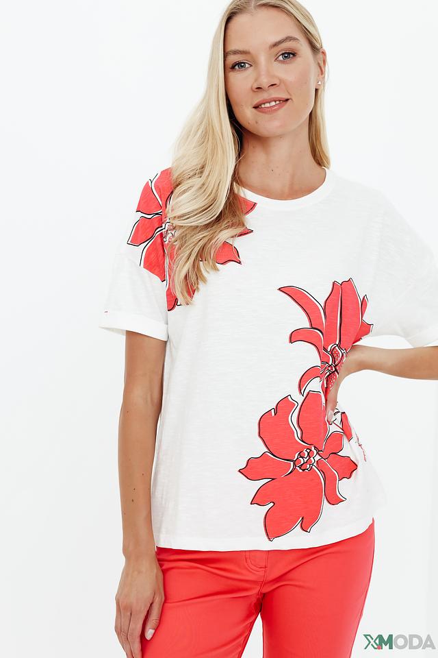 Белая футболка Olsen с ярким цветочным принтом. Изготовлена из 100% хлопка, обеспечивая комфорт и воздухопроницаемость. Стильный и лёгкий вариант для повседневного образа. Состав: хлопок 100%