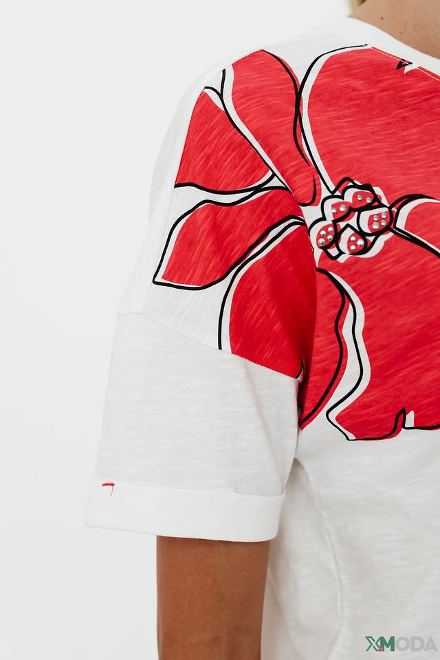 Особенностью данной модели является яркий принт в виде красных цветов, который добавляет образу свежести и женственности. Футболка имеет прямой крой и короткие рукава, что делает её идеальным выбором для тёплой погоды.