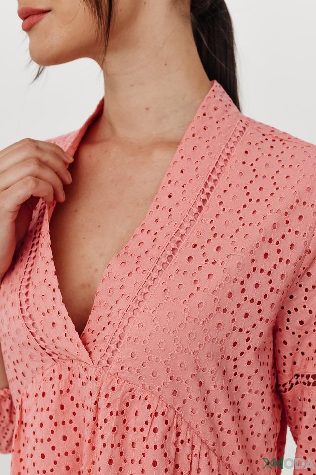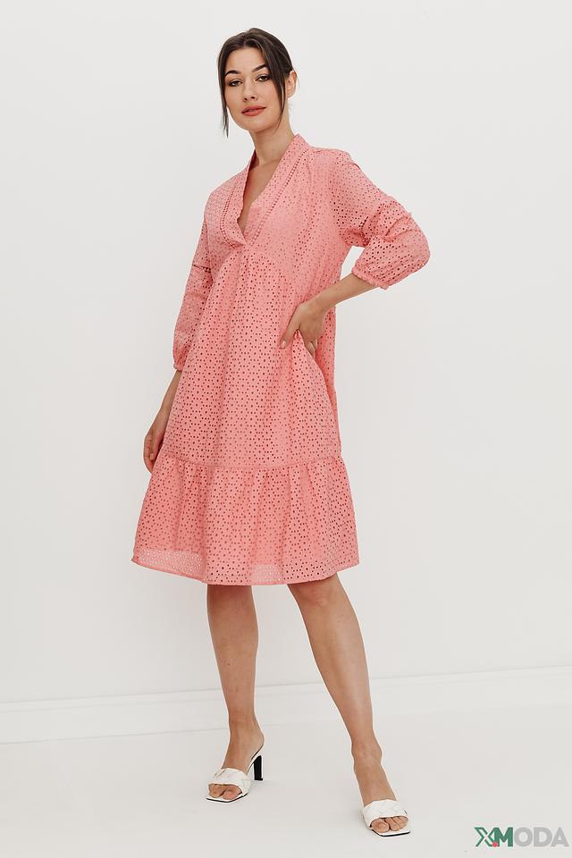Платье Olsen нежно-персикового цвета выполнено из хлопка с перфорацией. Модель имеет V-образный вырез, короткие рукава и многоярусную юбку, что придает ей лёгкость и воздушность. Состав: хлопок 100%, Состав_подкладка хлопок 100%