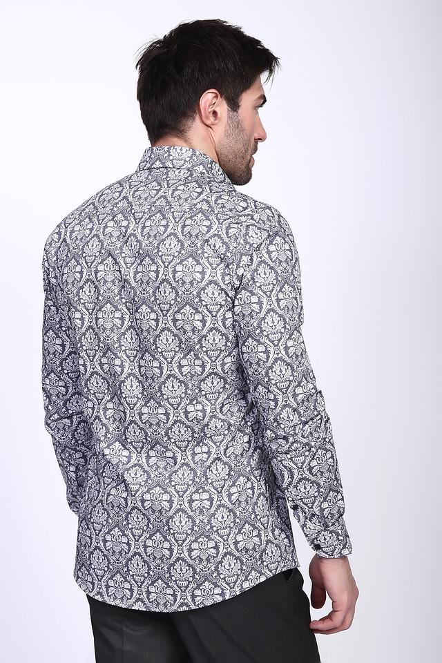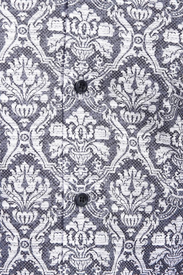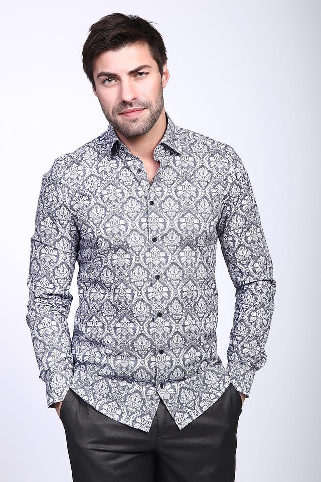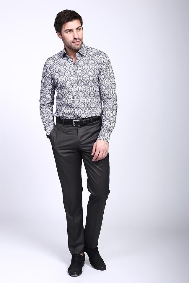 Рубашка имеет классический крой и длинные рукава. Её отличает стильный узор в серо-белой гамме, который придаёт ей элегантный и современный вид. Воротник рубашки выполнен в классическом стиле, что позволяет сочетать её с различными галстуками.