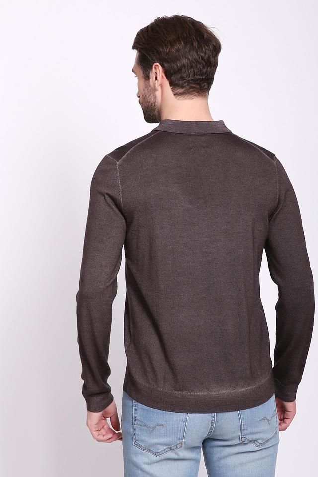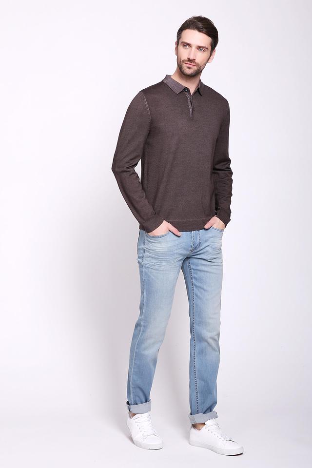 Джемпер имеет воротник-поло с небольшой планкой на пуговицах, что придает ему более формальный вид. Текстура вязки мелкая и аккуратная. Рукава джемпера – длинные, с манжетами.