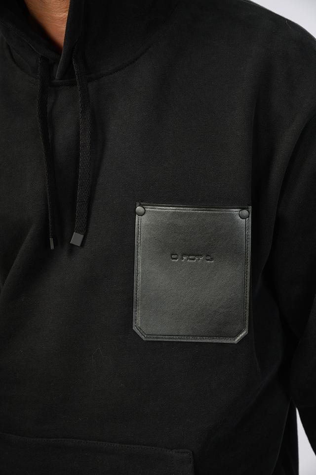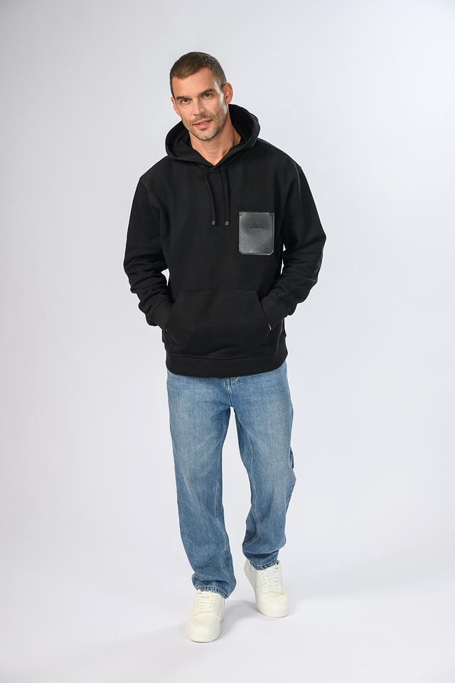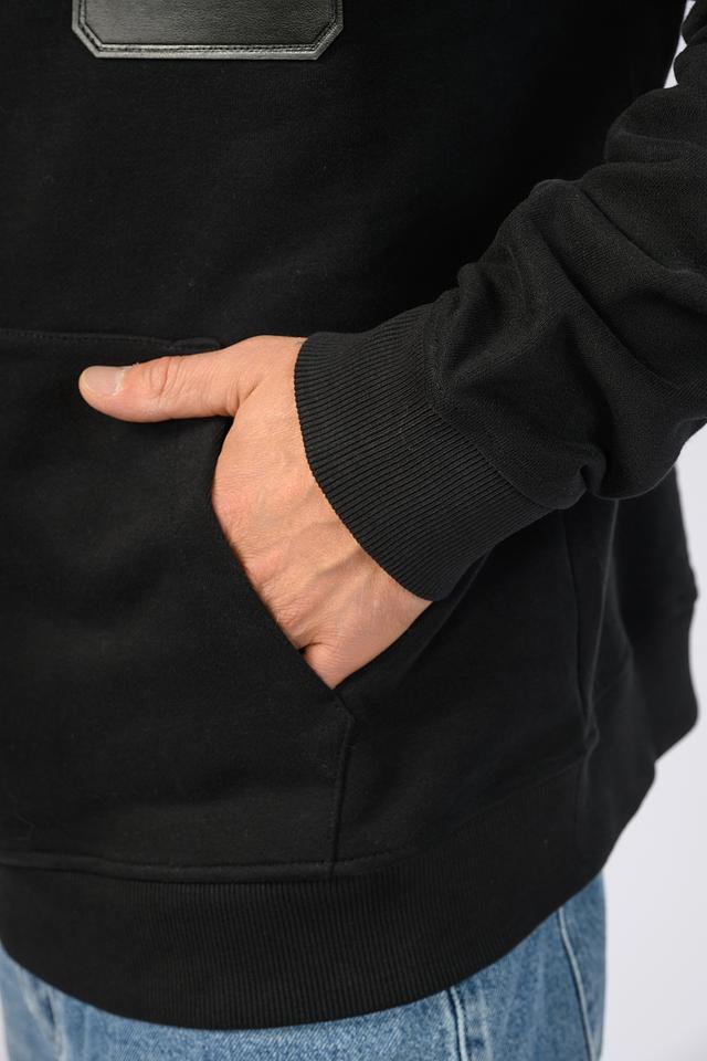 Толстовка имеет прямой крой, удобный капюшон со шнурками и вместительный накладной карман на груди. Отличительной особенностью является декоративная вставка из искусственной кожи с логотипом бренда, которая добавляет образу современный акцент.