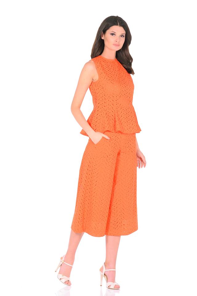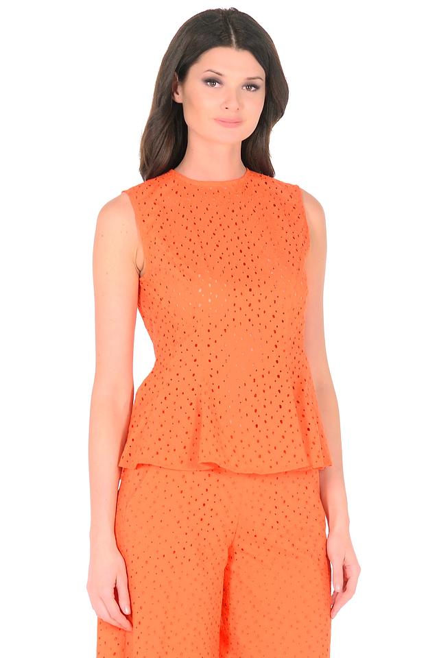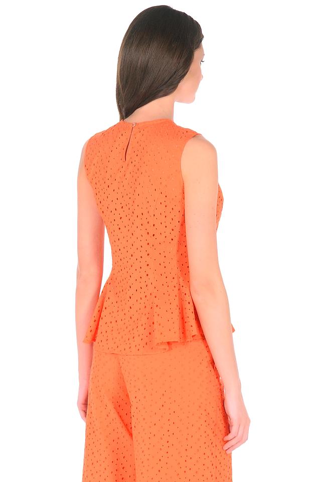 Блуза имеет яркий оранжевый цвет и украшена изысканной ажурной вышивкой по всей поверхности, что придает ей неповторимый и элегантный вид. Короткий рукав и округлый вырез горловины делают ее идеальным выбором для теплой погоды.