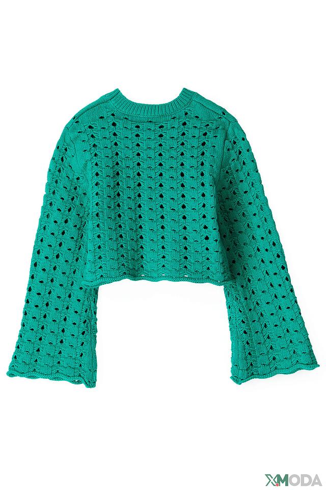 Джемпер имеет свободный крой, который не сковывает движений, и короткий рукав-фонарик, добавляющий образу игривости. Особый шарм изделию придает ажурный узор, выполненный по всей поверхности. Благодаря этому джемпер отлично пропускает воздух и позволяет коже дышать.