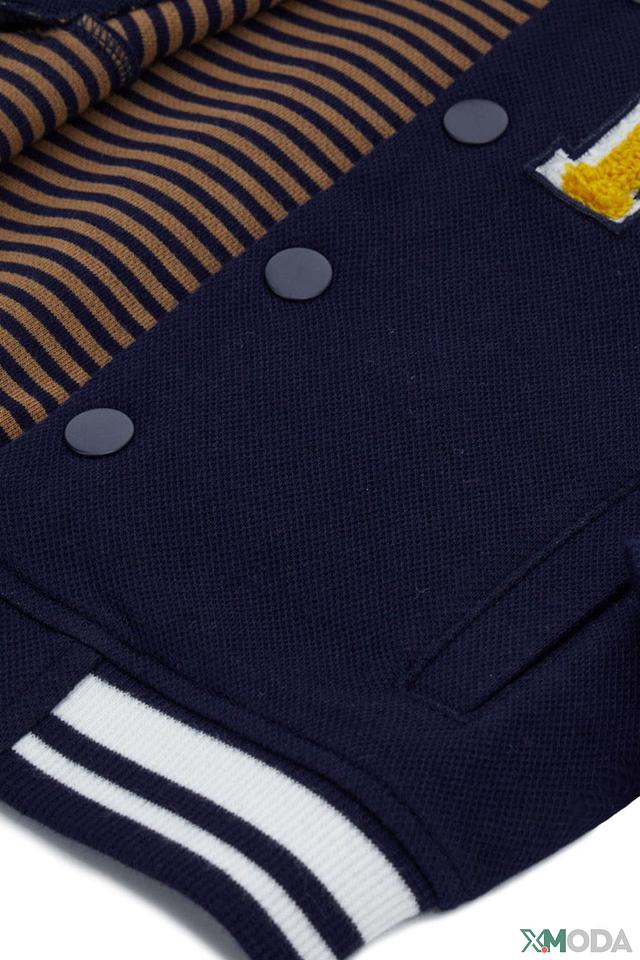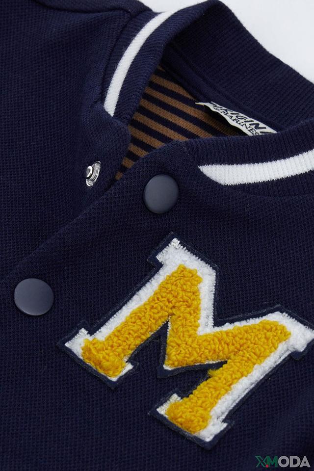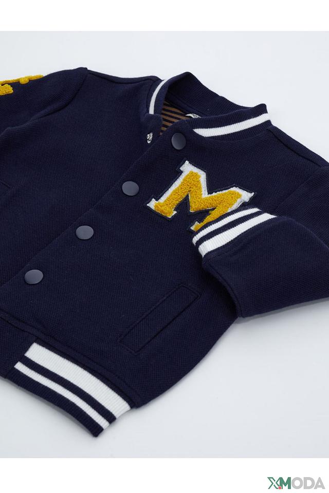 Кардиган выполнен в классическом синем цвете, украшен яркими нашивками в виде буквы "M" и якоря, что придает ему игривый и запоминающийся вид. Застежка на пуговицы позволяет легко надевать и снимать кардиган, а эластичные манжеты и нижний край обеспечивают комфортную посадку.