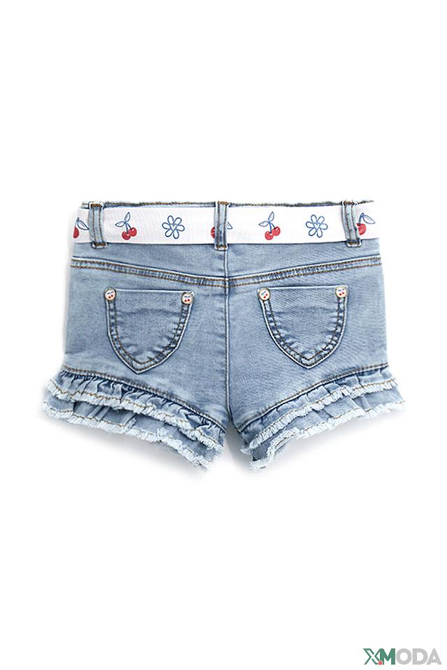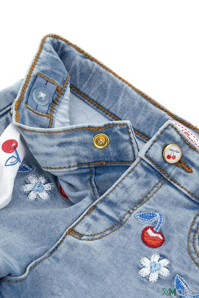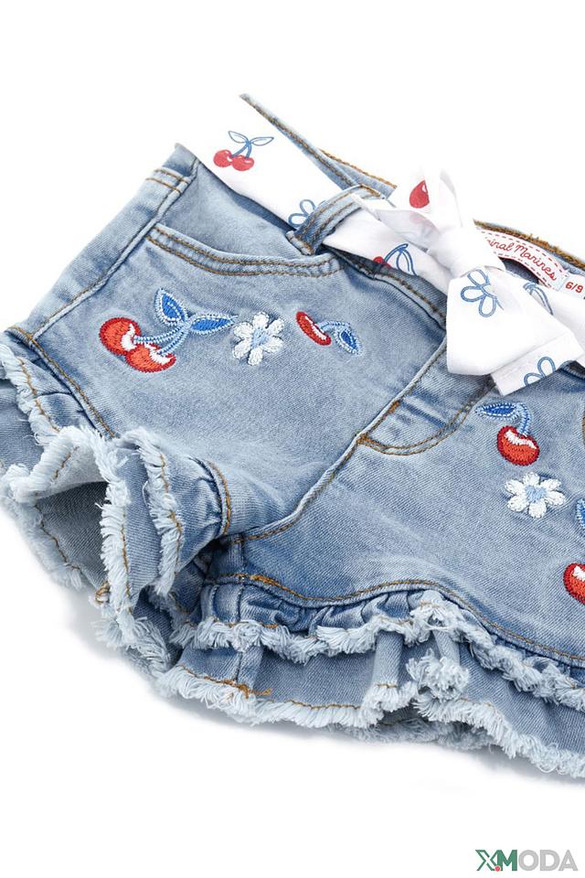 Джинсовые шорты Original Marines голубого цвета, украшены яркой вышивкой в виде вишен и цветочков. Модель с забавным бахромчатым краем и эластичным поясом для комфортной посадки. Состав: хлопок 97%, эластан 3%