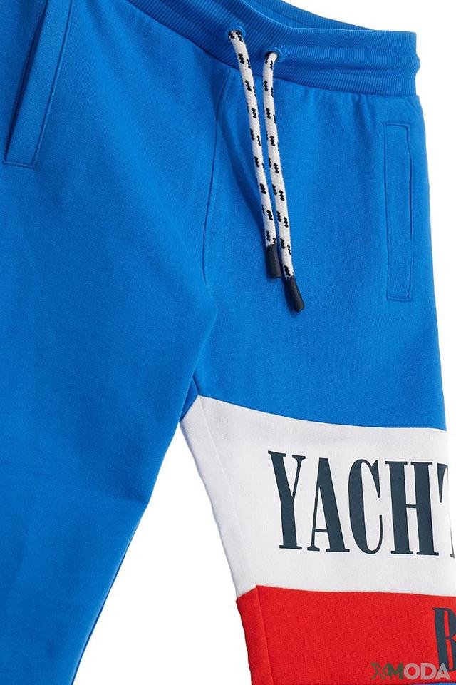 Брюки имеют удобный крой, не сковывающий движений, и эластичный пояс с регулируемым шнурком для надежной фиксации. На боковой части брюк расположен яркий цветной принт с надписью "YACHT" и "WING INSIDE", добавляющий образу индивидуальность.