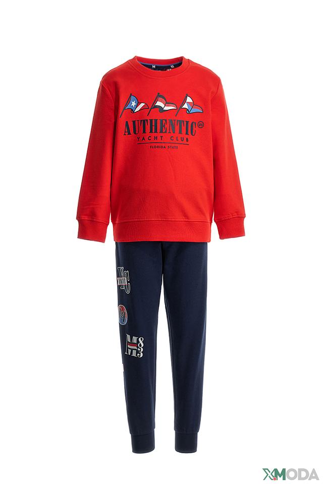 Джемпер имеет классический крой с круглым вырезом горловины и манжетами на рукавах. Главная деталь – яркий принт в виде развевающихся флагов и надписи "AUTHENTIC YACHT CLUB", который придаёт комплекту динамичный и спортивный вид. Материал джемпера – 100% хлопок, что обеспечивает комфорт и мягкость при носке.