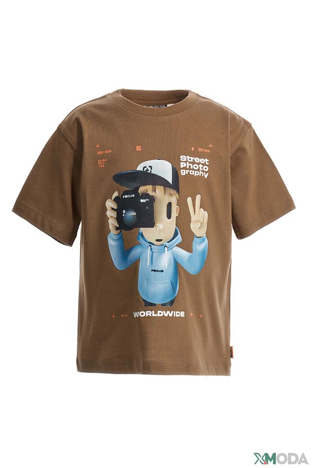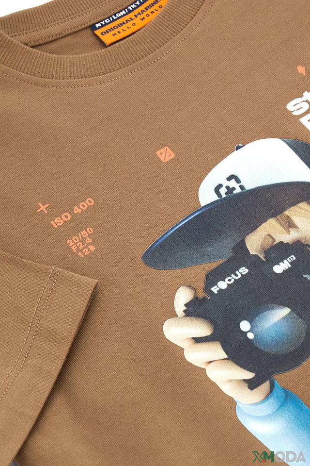 Эта футболка от Original Marines станет отличным дополнением к гардеробу вашего мальчика. Она выполнена в приятном коричневом цвете и украшена оригинальным принтом, изображающим мальчика-фотографа.
