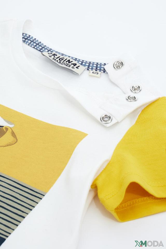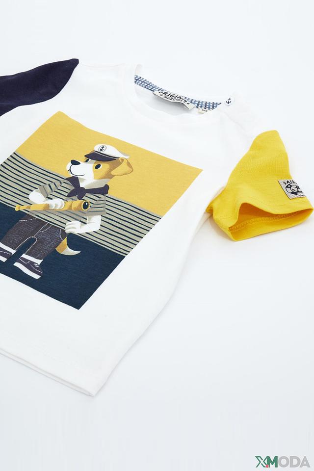 Модель имеет классический крой, короткие рукава и круглый вырез горловины. Рукава футболки выполнены в контрастных цветах: правый рукав – жёлтый, левый – тёмно-синий. На плече расположена небольшая декоративная деталь с логотипом бренда.