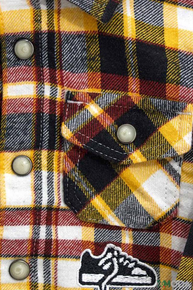Рубашка имеет классический крой с длинными рукавами и застёжкой на пуговицы. Яркий клетчатый принт в сочетании жёлтого, красного и чёрного цветов делает эту рубашку стильной и привлекательной.
