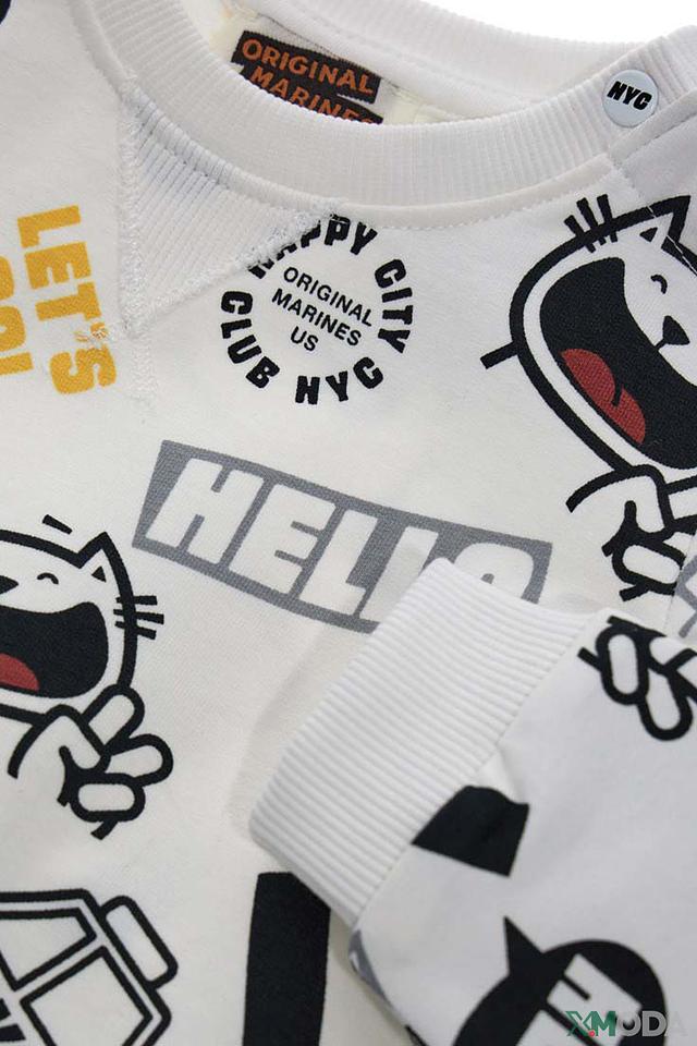 Свитшот Original Marines – это стильная и удобная одежда для мальчиков. Модель выполнена в молочном цвете и украшена забавным принтом с изображением котика, надписями "HELLO", "HEY!", "LET'S GO!", а также элементами, ассоциирующимися с Нью-Йорком (такси, надпись NYC).