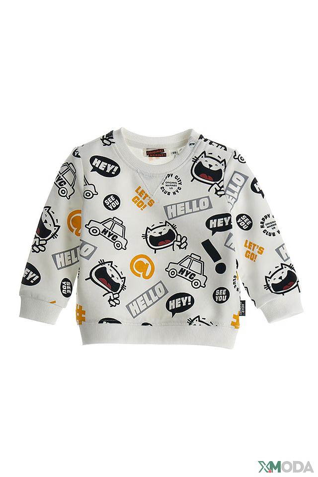 Свитшот Original Marines – это стильная и удобная одежда для активных мальчиков. Модель выполнена в белом цвете и украшена забавным принтом с изображением кота, надписями "HELLO", "HEY!", "LET'S GO!", а также элементами, ассоциирующимися с Нью-Йорком (такси, надпись "NYC").