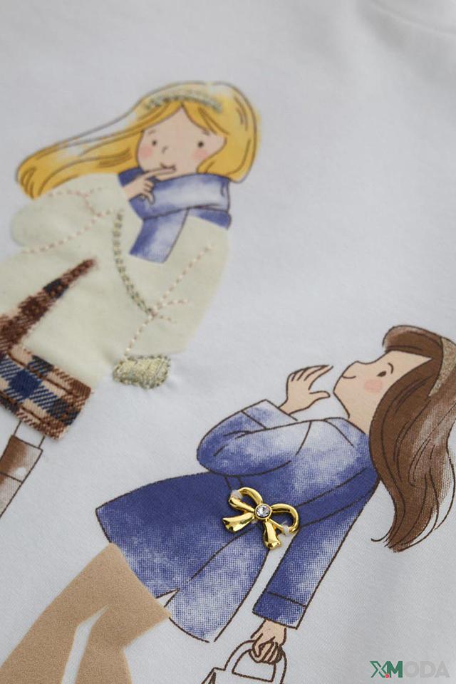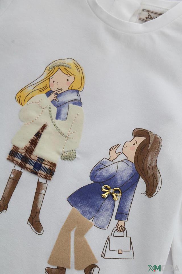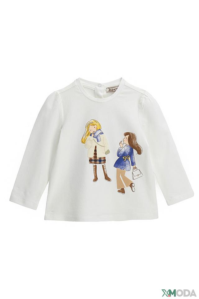 Особенностью данной модели является яркий и милый принт с изображением двух девочек в стильной одежде. Длинные рукава делают футболку подходящей для прохладной погоды или для создания многослойного образа.
