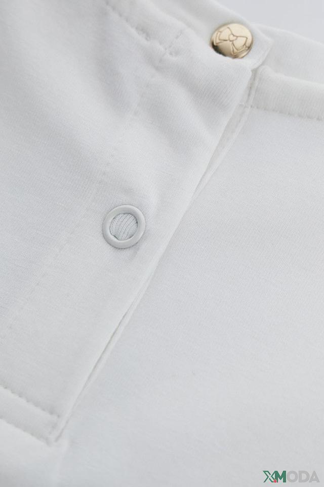Футболка имеет круглый вырез горловины, который аккуратно оформлен. Небольшой декоративный элемент в виде пуговицы добавляет изысканности. Благодаря своему универсальному дизайну, эта футболка легко сочетается с другими элементами одежды, такими как джинсы, юбки или шорты.