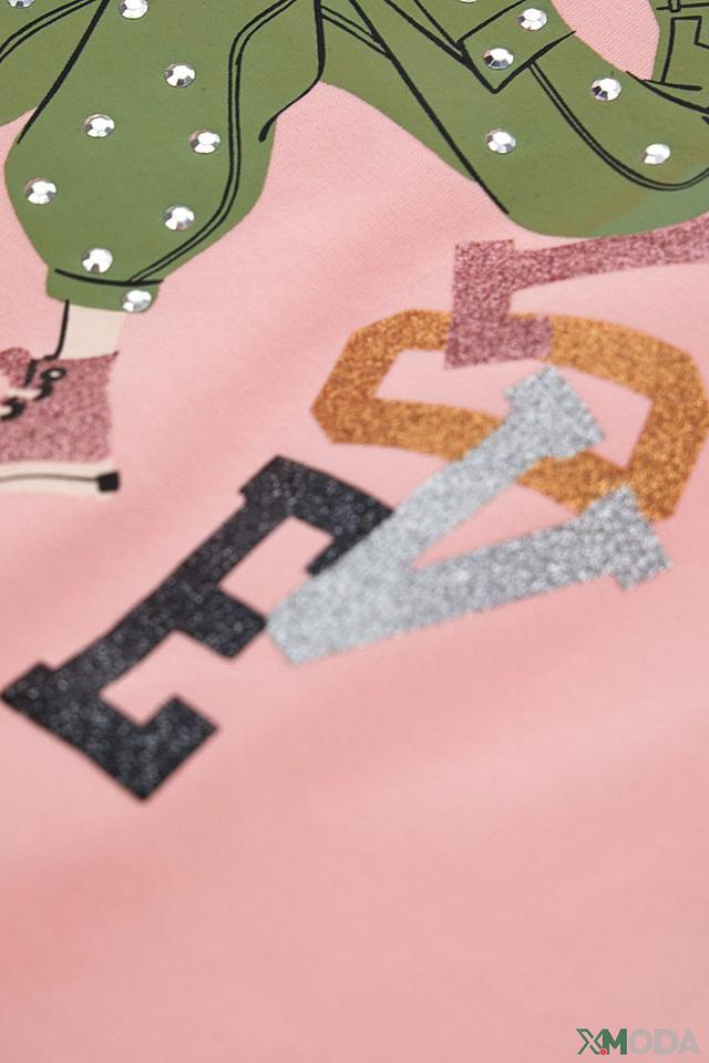 Дизайн футболки украшен ярким и привлекательным принтом с изображением девочки в стильной одежде и надписью. Принт выполнен в различных цветах и с использованием блестящих элементов, что делает футболку особенно нарядной и интересной.