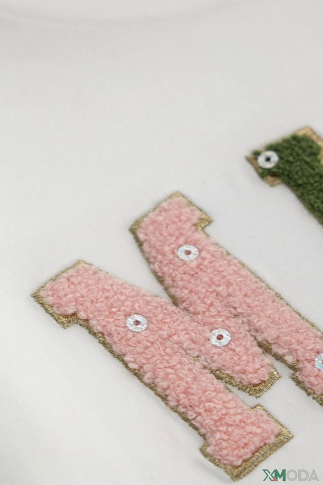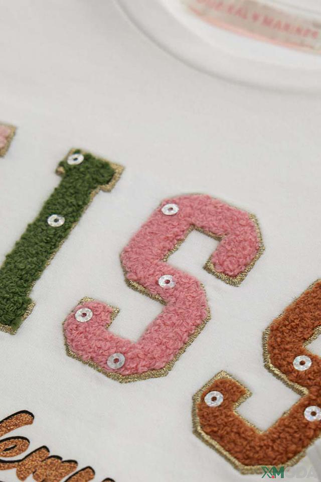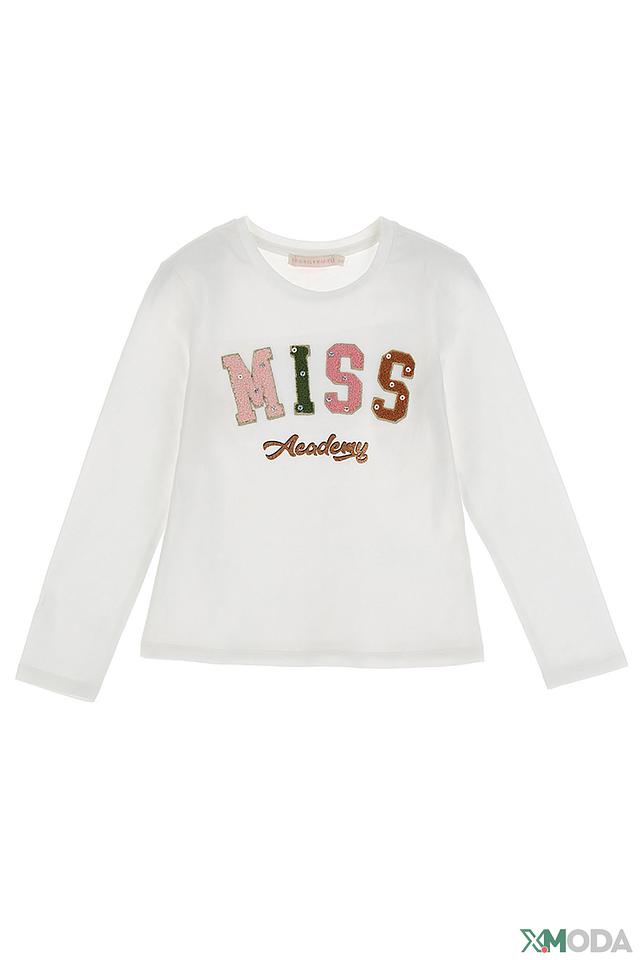 Особенностью данной футболки является яркий и привлекательный принт "Miss 5", выполненный в виде аппликации с использованием различных текстур и цветов. Буквы и надпись "Academy" выполнены в технике пэчворк, что придает изделию оригинальность и неповторимый стиль.