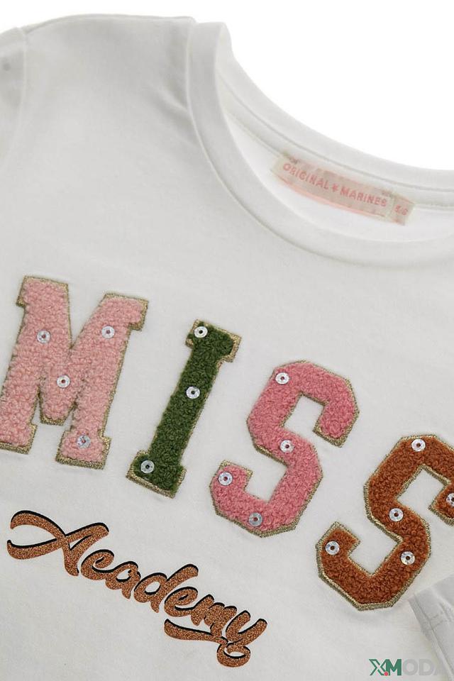Белая футболка Original Marines для девочки с ярким принтом "Miss 5". Изготовлена из мягкого хлопка с добавлением эластана для комфорта и свободы движений. Стильный и удобный вариант для повседневной носки. Состав: хлопок 92%, эластан 8%