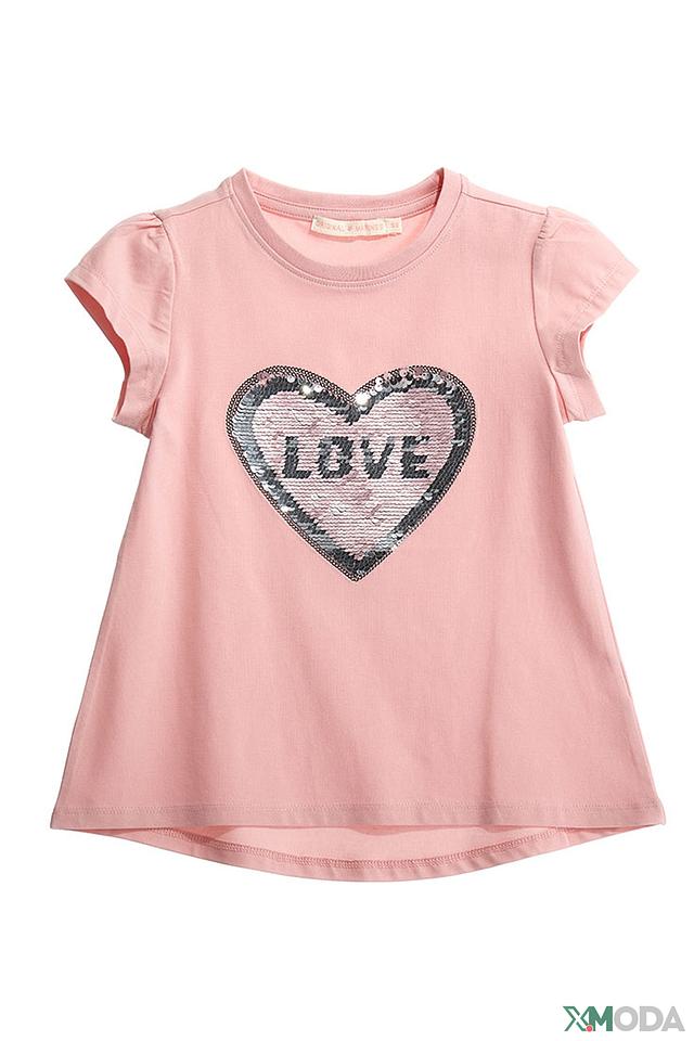 Основным акцентом футболки является аппликация в виде сердца, выполненная из мерцающей пайетки. Благодаря такому декору, футболка выглядит нарядно и привлекательно. Круглый вырез горловины и короткие рукава делают футболку удобной для повседневной носки.
