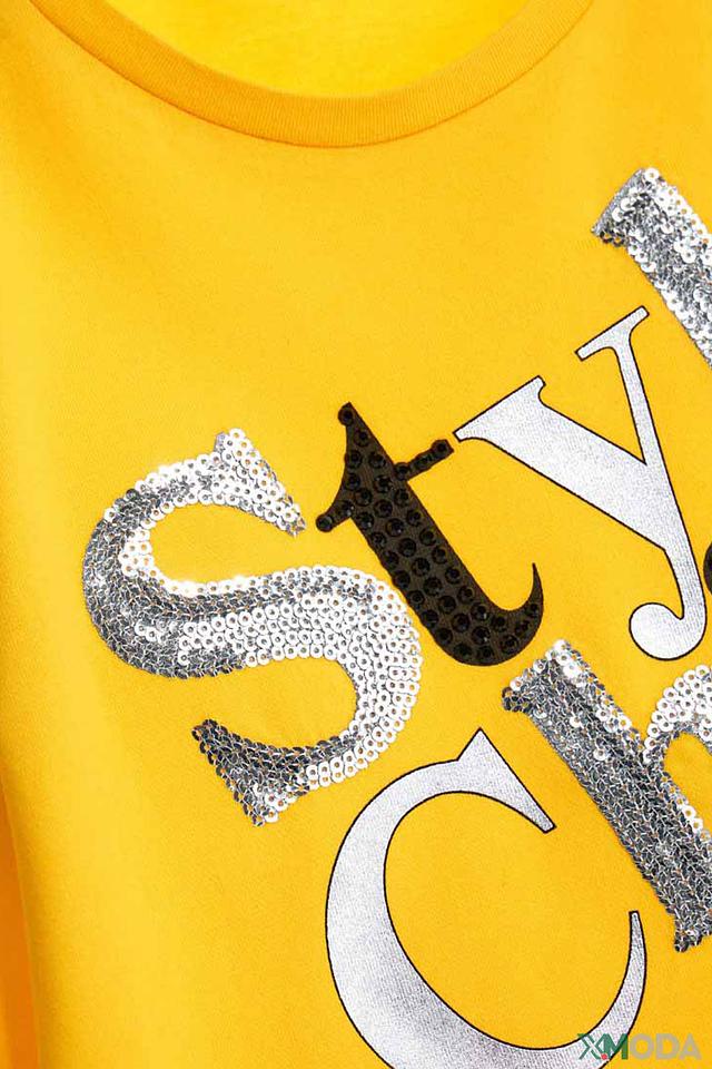 Особенностью данной футболки является эффектный принт "Style Chic", выполненный в сочетании серебристых и чёрных цветов. Буквы частично декорированы пайетками, что придает изделию праздничный и нарядный вид.