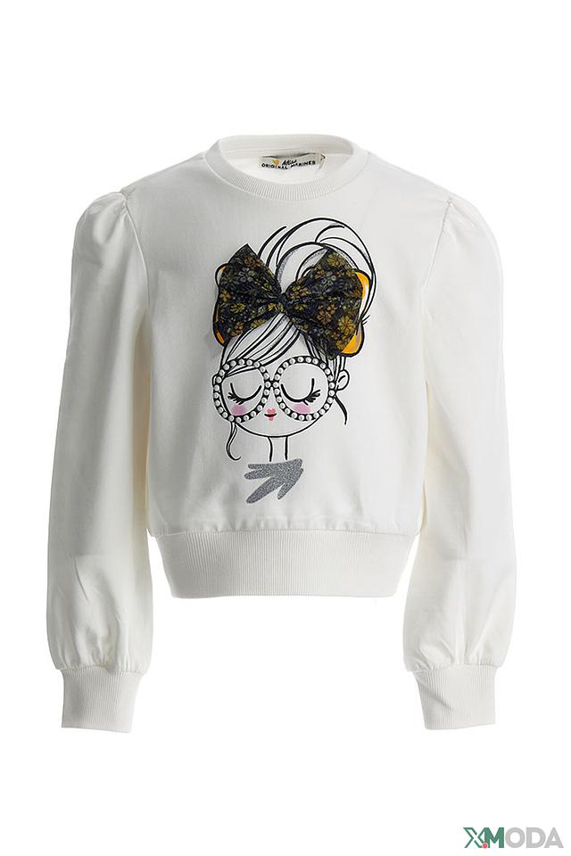 Этот очаровательный свитшот от Original Marines станет отличным дополнением к гардеробу юной модницы. Выполненный в белом цвете, он украшен оригинальным принтом с изображением девушки в больших очках и бантиком.