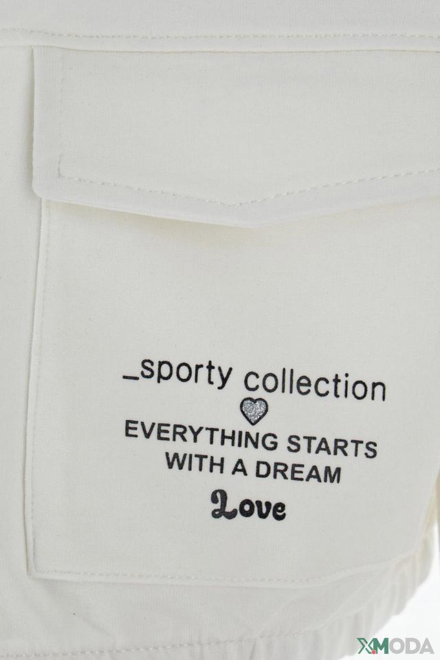 Модель имеет свободный крой, короткий рукав с манжетами и круглый вырез горловины. На передней части пуловера расположен накладной карман, украшенный ярким принтом с надписью "_sporty collection" и милым сердечком.
