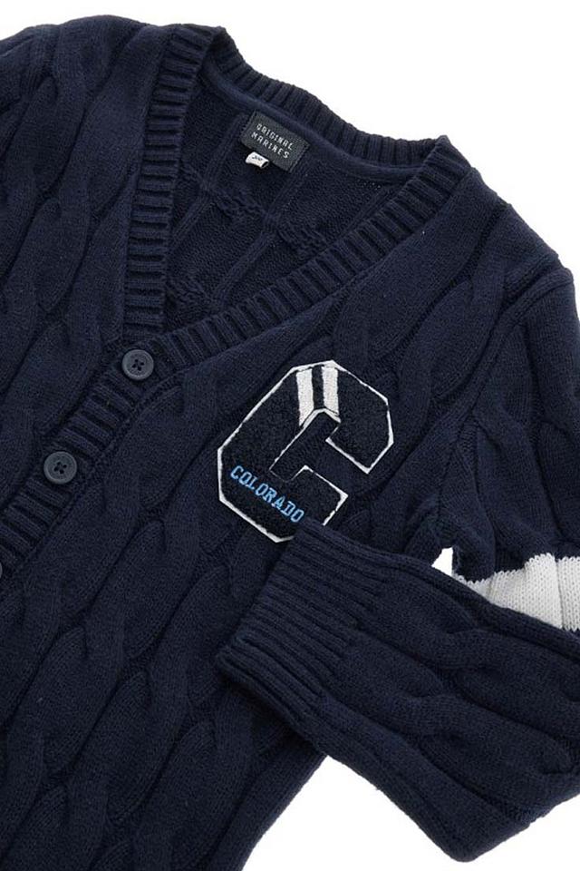 Тёмно-синий кардиган Original Marines для мальчика, выполнен из мягкого трикотажа с добавлением шерсти. Модель с V-образным вырезом, застёжкой на пуговицы и декоративной нашивкой. Состав: хлопок 60%, полиамид 30%, шерсть 10%. Состав: хлопок 60%, полиамид 30%, шерсть 10%