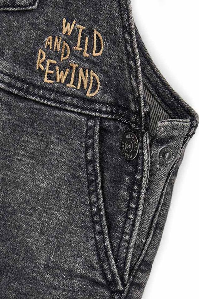 Особенностью данной модели является милый принт в виде жирафа на передней части брюк, а также надпись "WILD AND REWIND". Регулируемые бретели позволяют настроить посадку по росту ребёнка. Удобные карманы добавляют функциональности. Застёжка на пуговицах обеспечивает лёгкость одевания и снятия комбинезона.