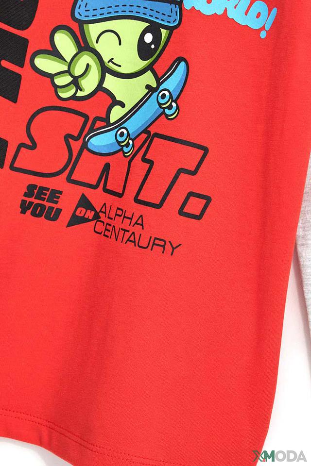 Модель украшена ярким принтом в виде инопланетянина на скейтборде и надписью "SPACE". Рукава лонгслива выполнены в сером цвете, что добавляет контрастности и оригинальности образу.