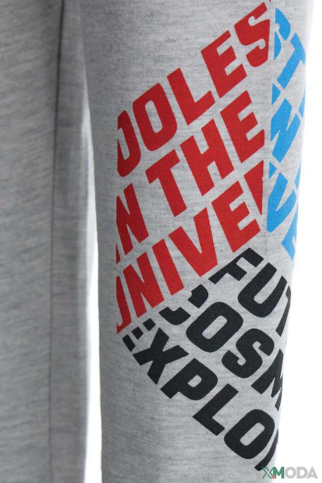 Брюки имеют классический крой с эластичным поясом и манжетами на щиколотках. На левой штанине расположен яркий, красочный принт с надписями и графическими элементами, который придаёт модели индивидуальность.
