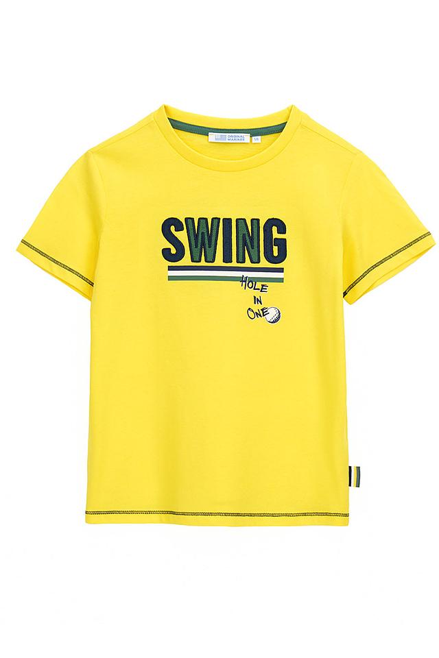 Жёлтая футболка Original Marines для мальчиков с ярким принтом "SWING". Изготовлена из 100% хлопка, обеспечивающего комфорт и воздухопроницаемость. Отличный выбор для активных детей! Состав: хлопок 100%