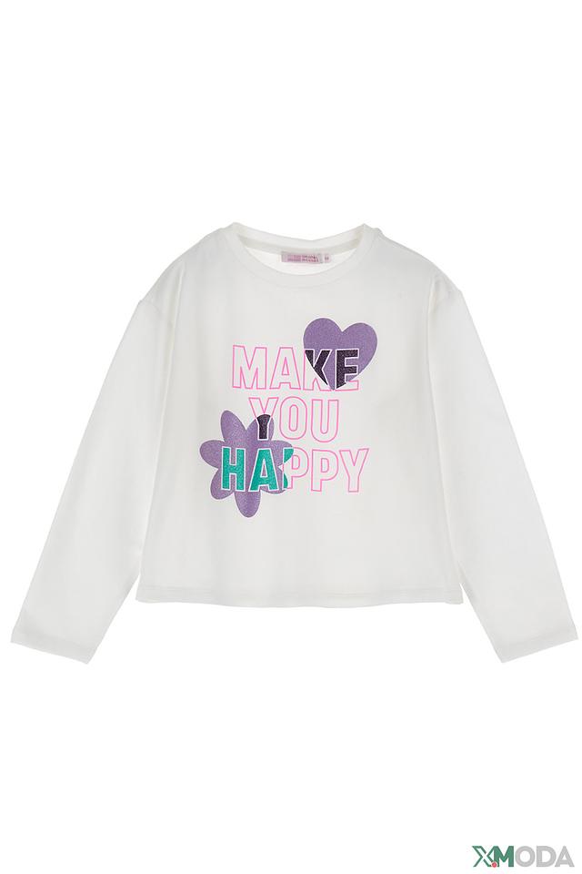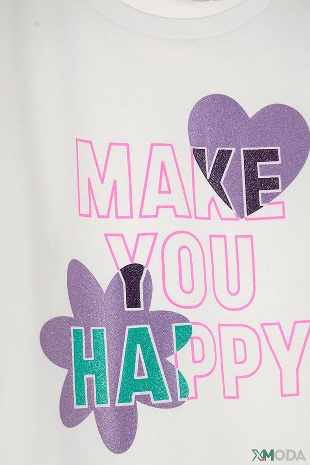 Футболка украшена ярким и позитивным принтом "Make You Happy", выполненным в лавандовых и фиолетовых тонах. Принт выполнен в виде надписи и нескольких сердечек с глиттером, что придает изделию игривый и нарядный вид.