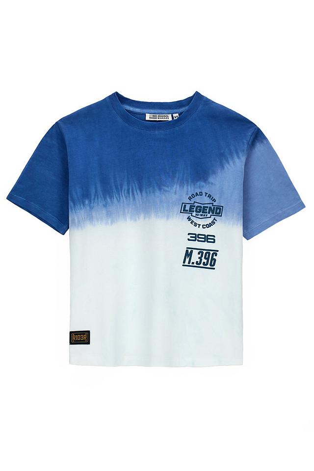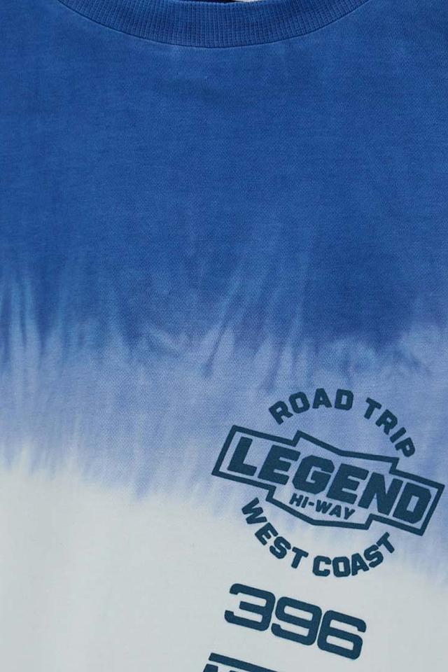 Особенностью данной модели является эффектный градиентный переход от насыщенного синего к белому цвету, создающий стильный и современный вид. На передней части футболки расположен яркий принт с надписью "ROAD TRIP LEGEND" и логотипом бренда.