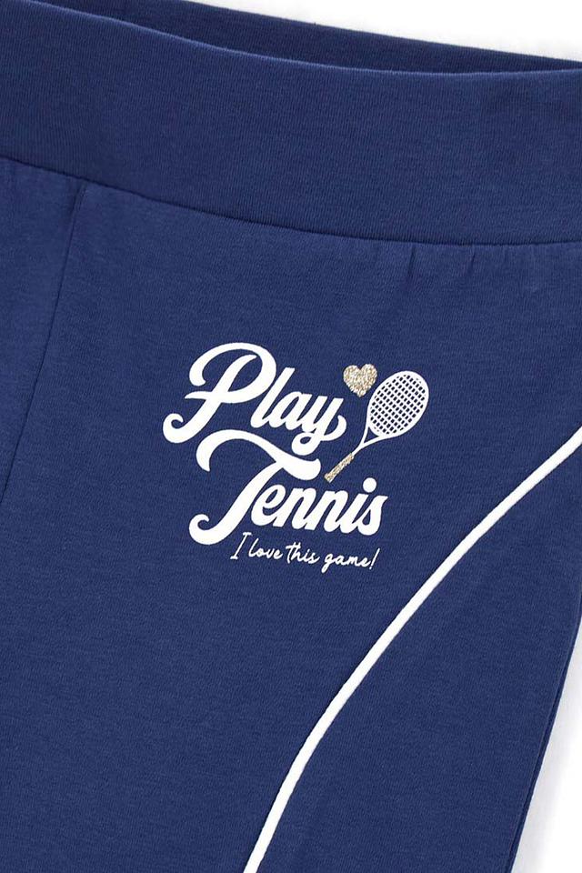 Дизайн леггинс выполнен в насыщенном синем цвете, который дополнен контрастными белыми полосами по бокам. На поясе расположен яркий принт с надписью “Play Tennis” и изображением теннисной ракетки, что придает образу игривость и спортивный стиль.
