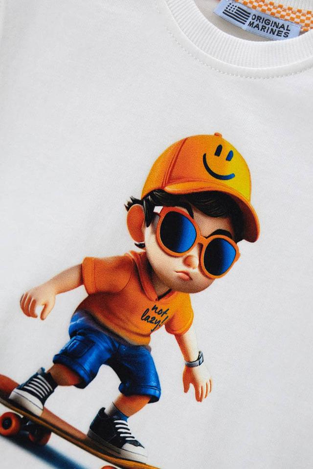 Особенности дизайна: футболка украшена ярким и забавным принтом с изображением мальчика на скейтборде, что придаёт ей игривый и современный вид. Принт выполнен в оранжевых, синих и чёрных тонах, что делает футболку особенно привлекательной.